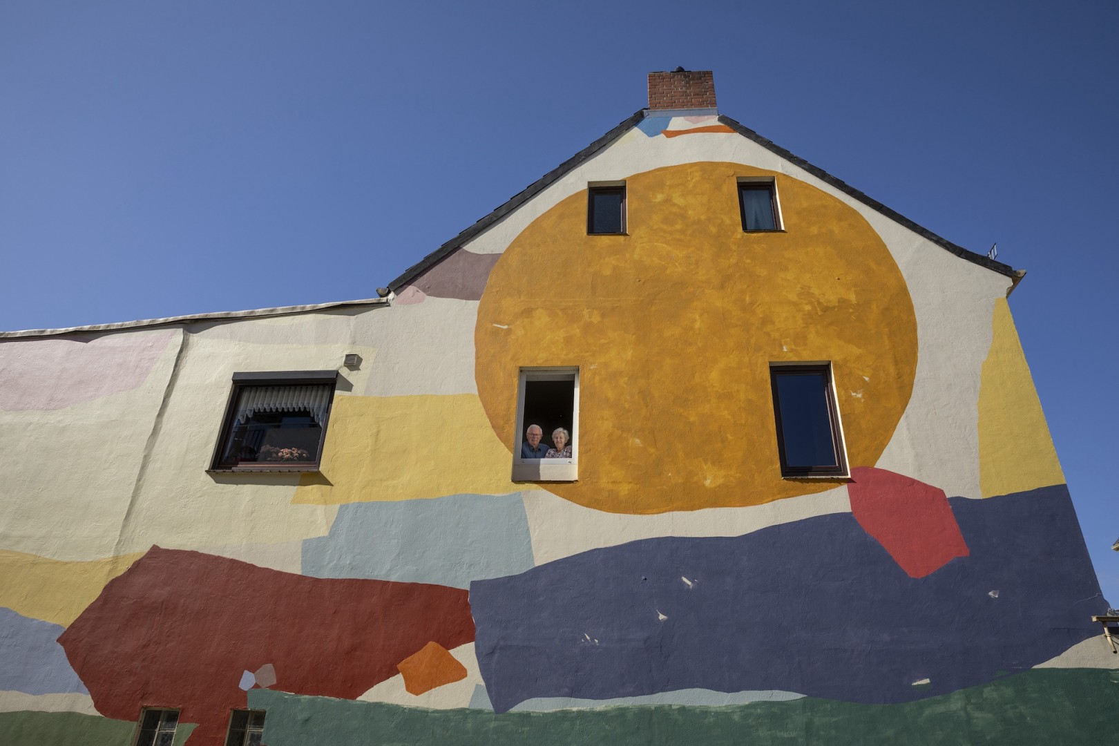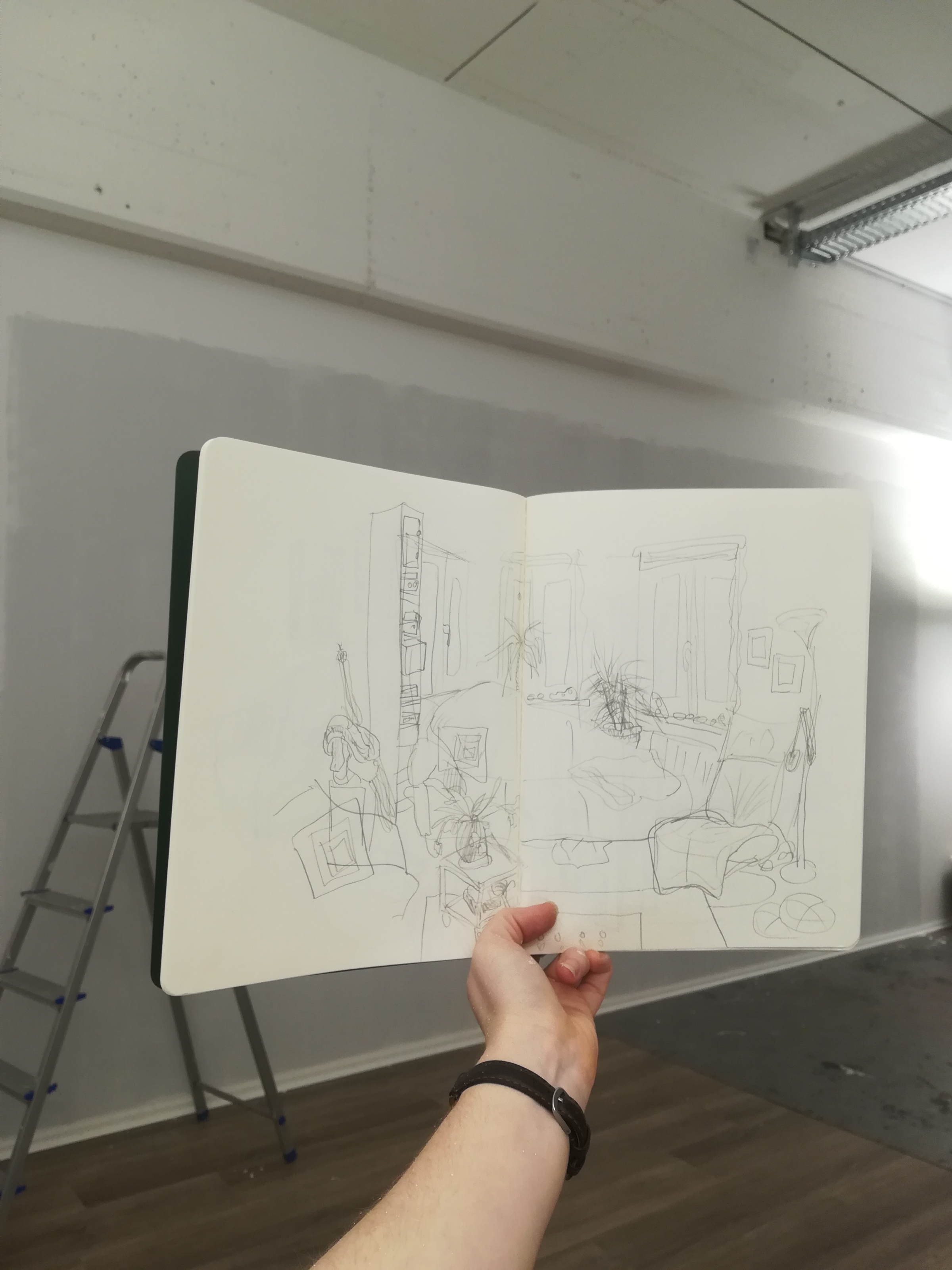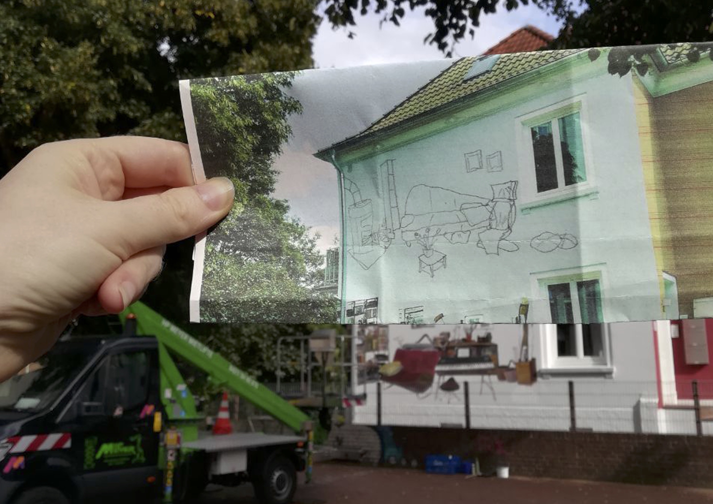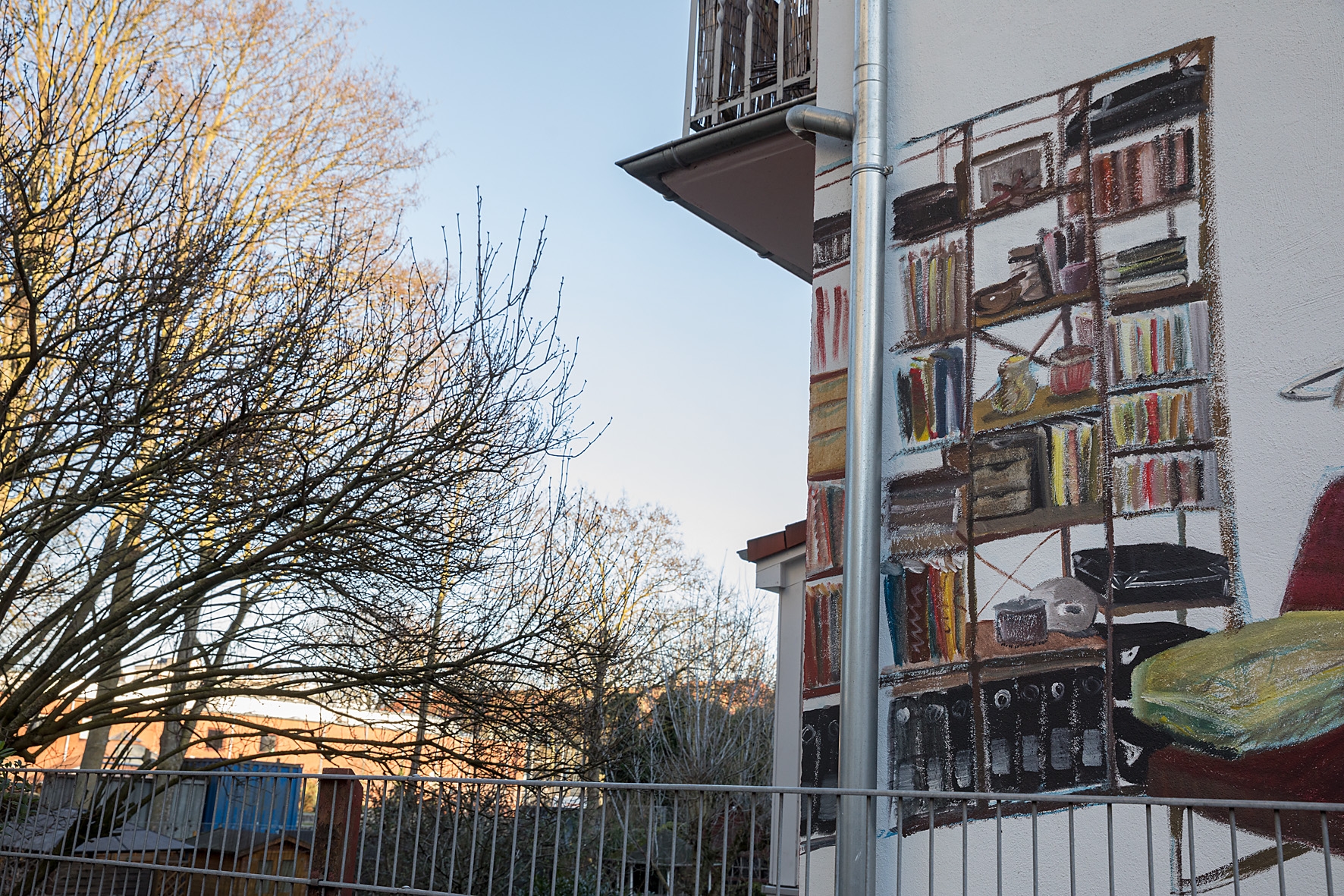Für die anfertigung der Skizzen hat sie viele Stunden alleine in den Privaten Räumlichkeiten der Bewohner\*innen verbracht. Im Atelier hat sie diese zum Bildmotiv zusammengetragen, bevor sie es direkt auf die Fassade gemalt hat. So ergibt sich eine besondere künstlerische Verschränkung des Privaten und des Öffentlichen.