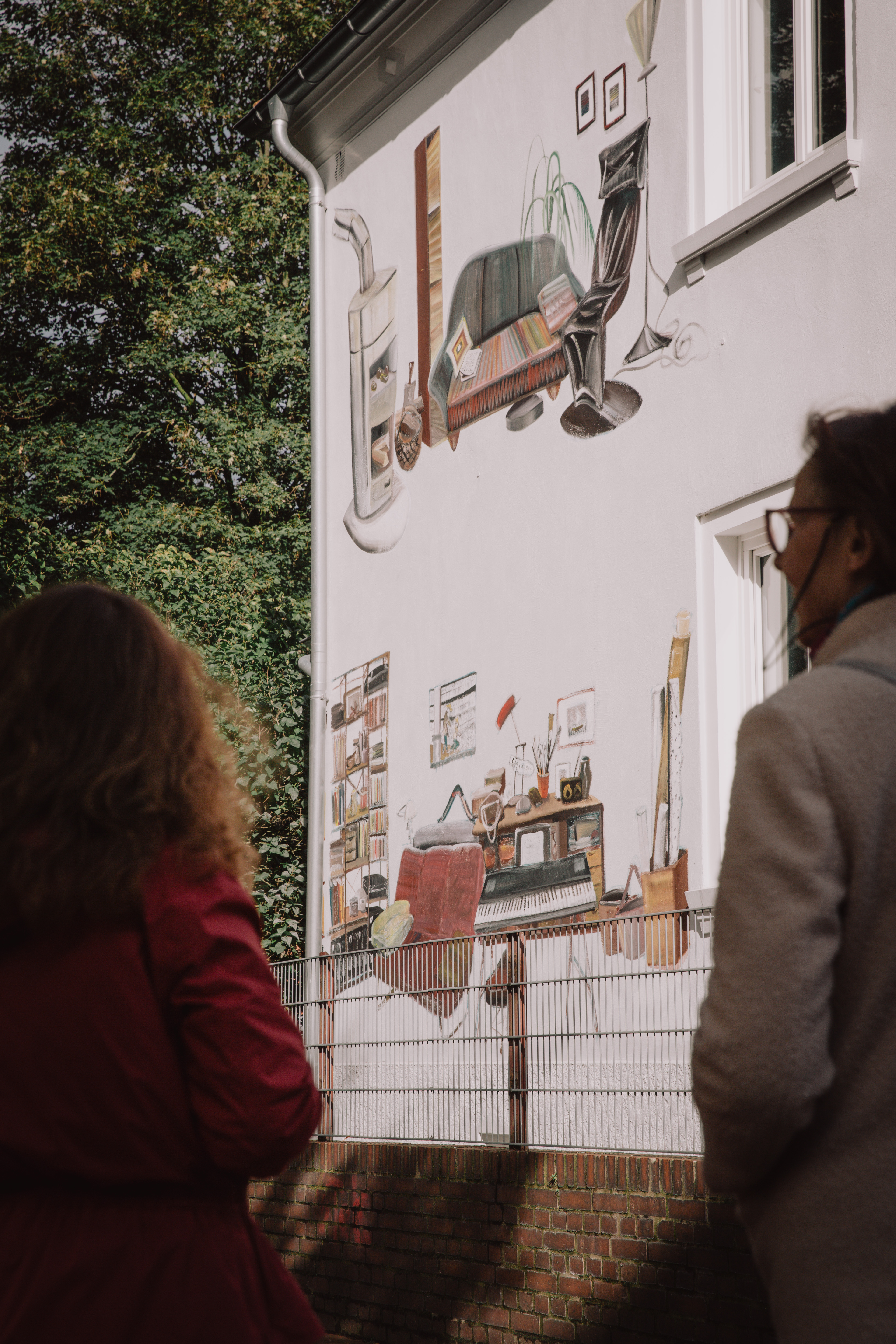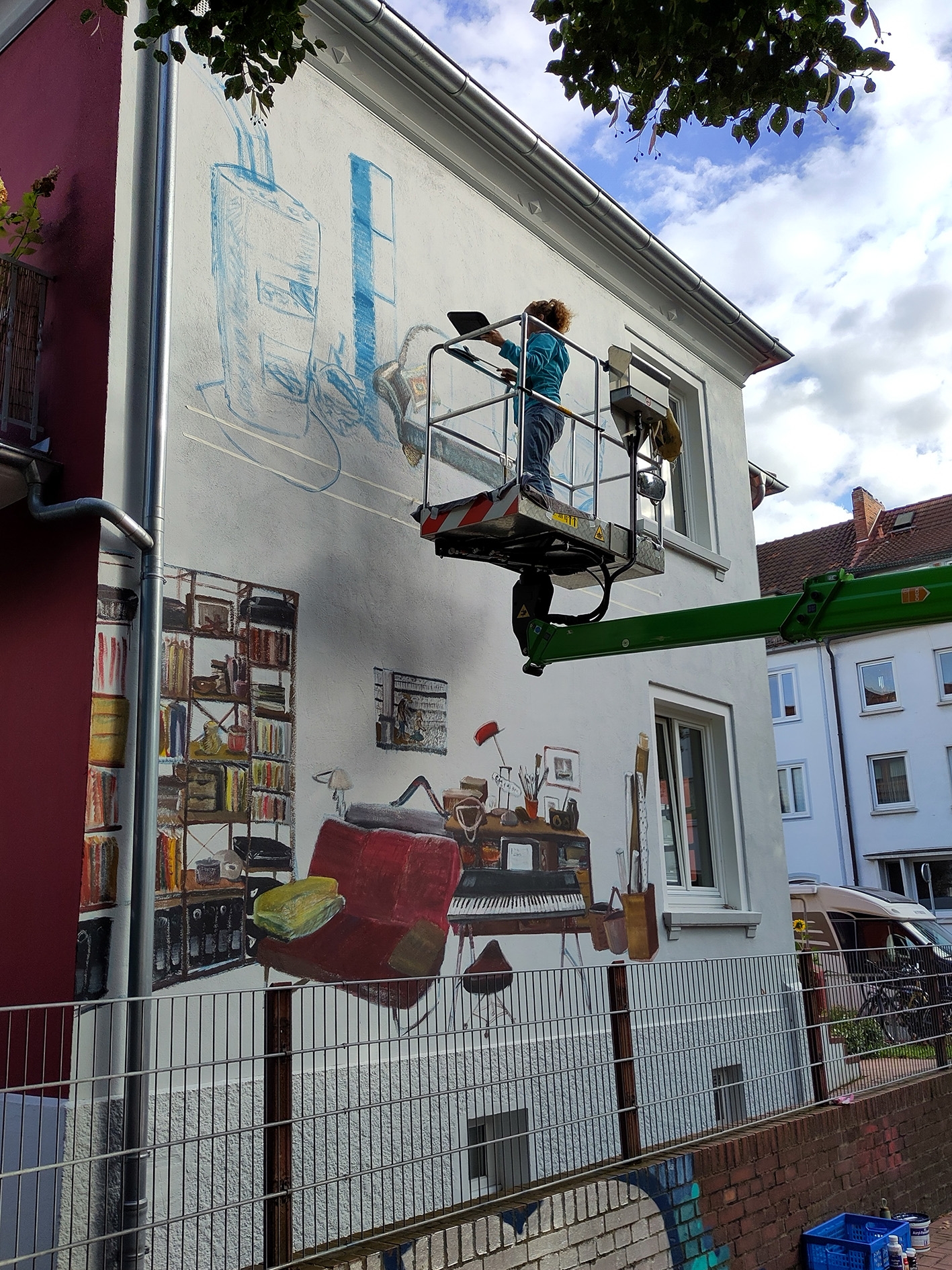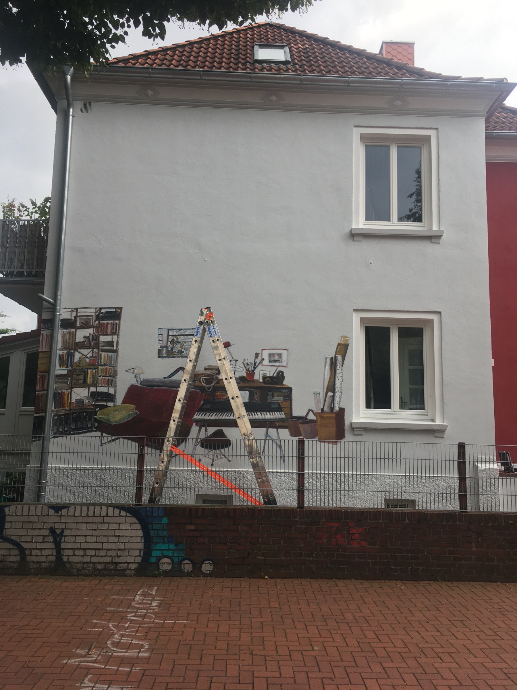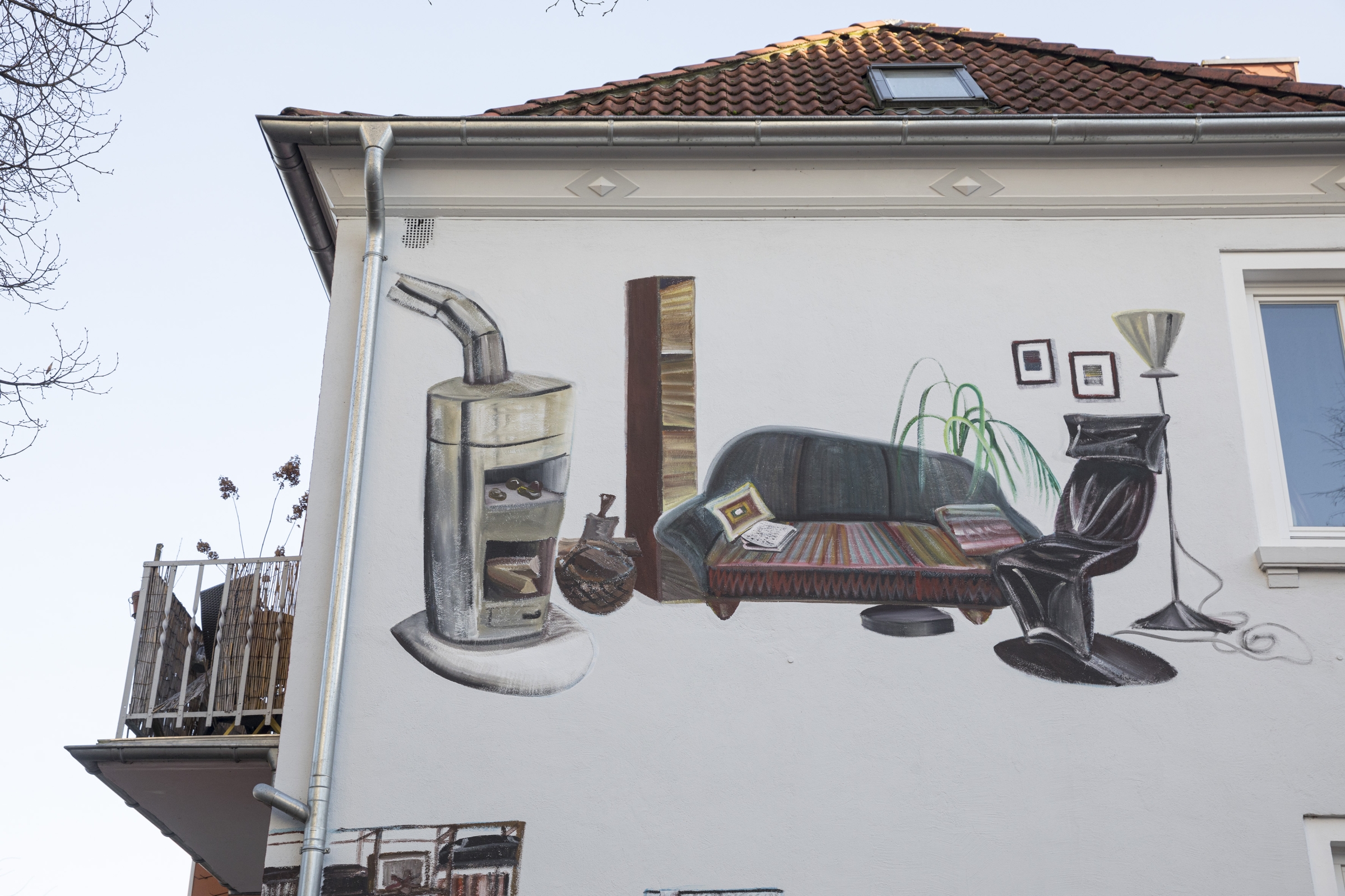 Im Sommer 2024 malte Anna Bart ein Wandbild über zwei Etagen des Wohnhauses Achimer Straße 30. In besonderer Maltechnik bringt sie hier malerisch die Einrichtungsgegenstände der Hauseigentümer\*innen auf die Fassade.