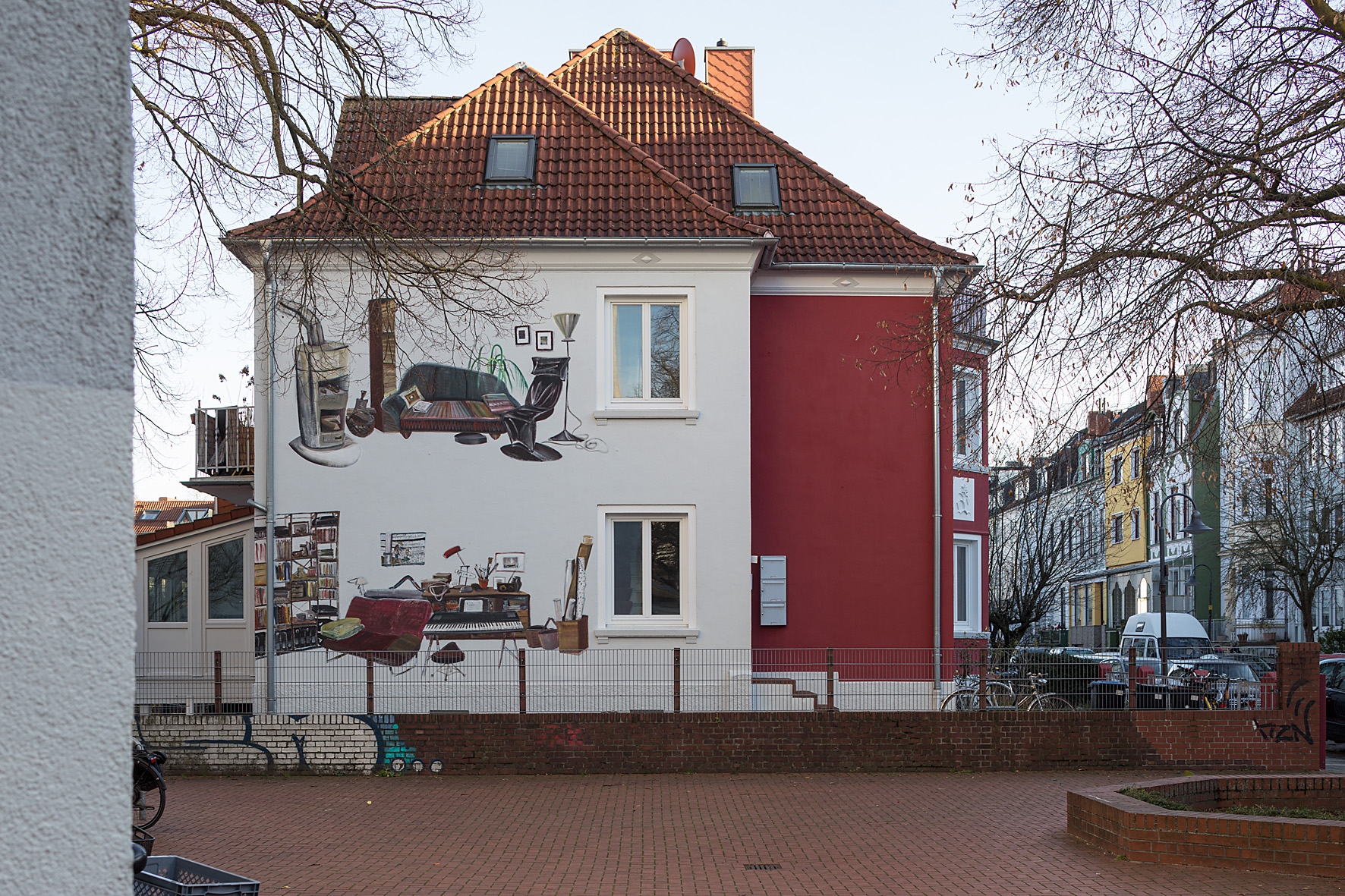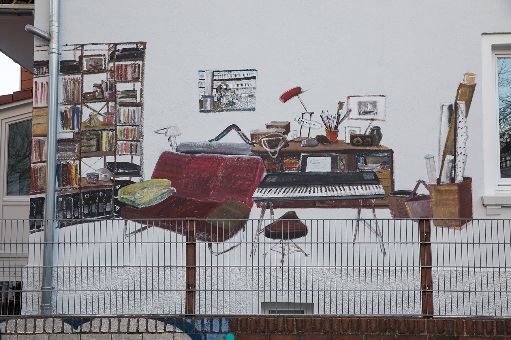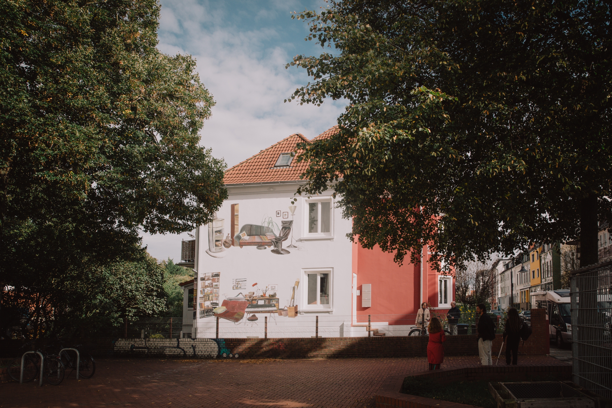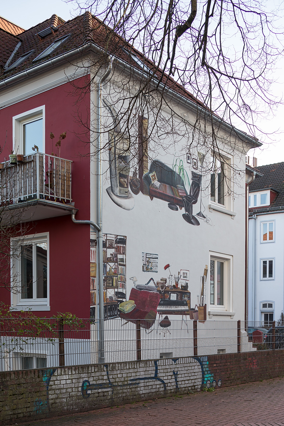 Im Sommer 2024 malte Anna Bart ein Wandbild über zwei Etagen des Wohnhauses Achimer Straße 30. In besonderer Maltechnik bringt sie hier malerisch die Einrichtungsgegenstände der Hauseigentümer\*innen auf die Fassade.