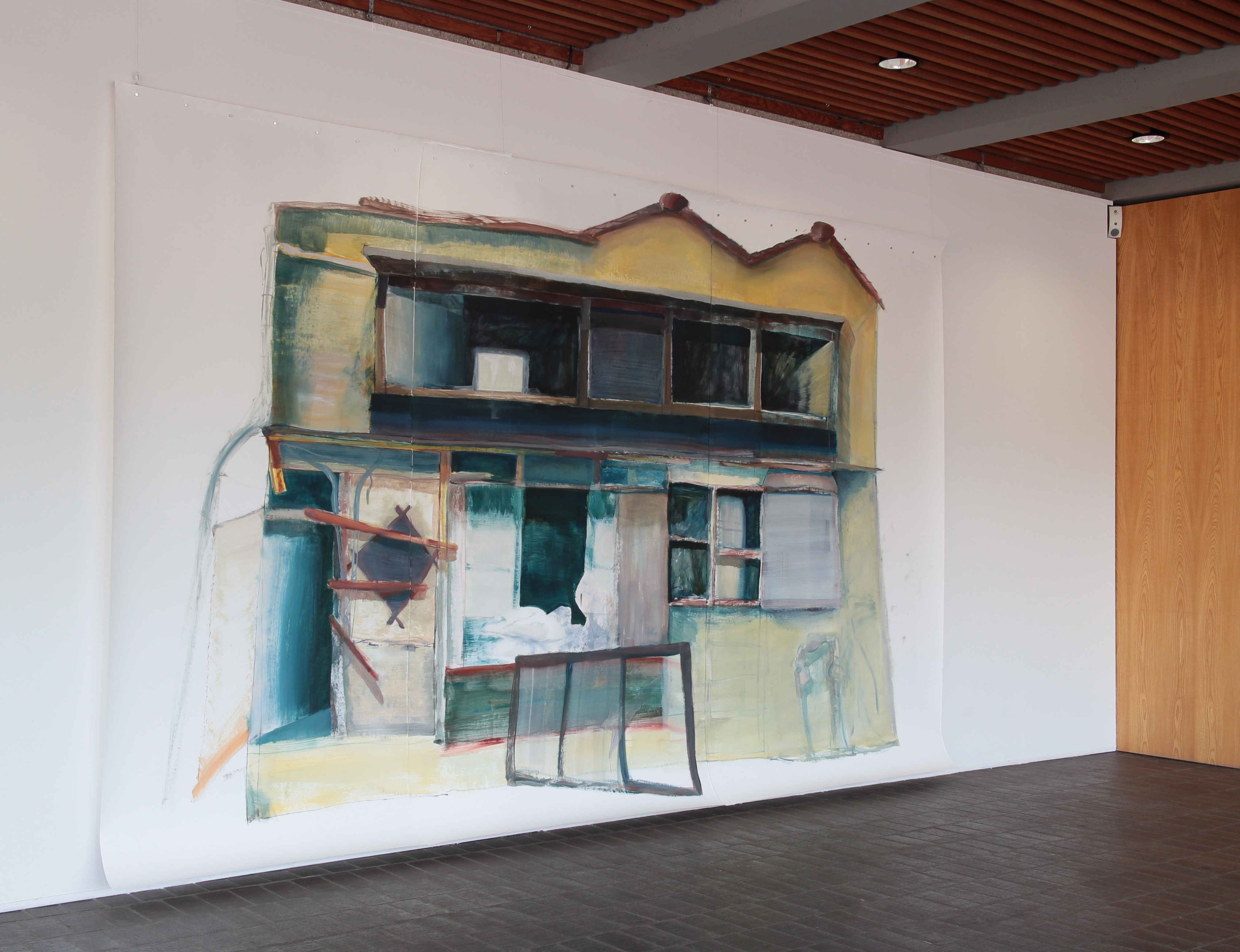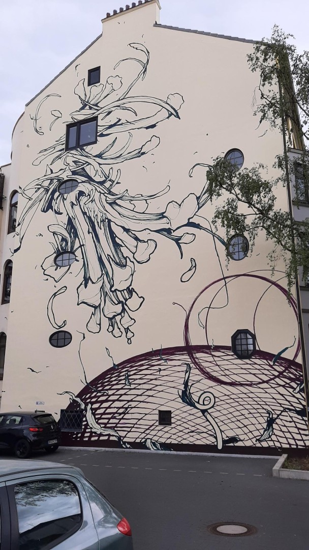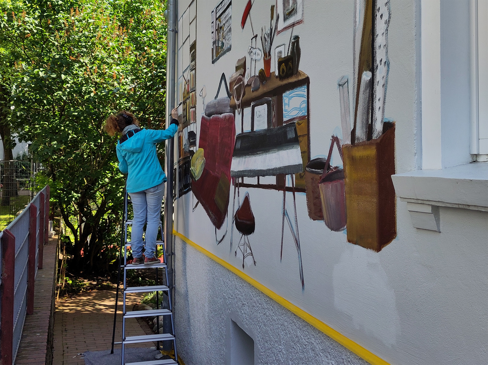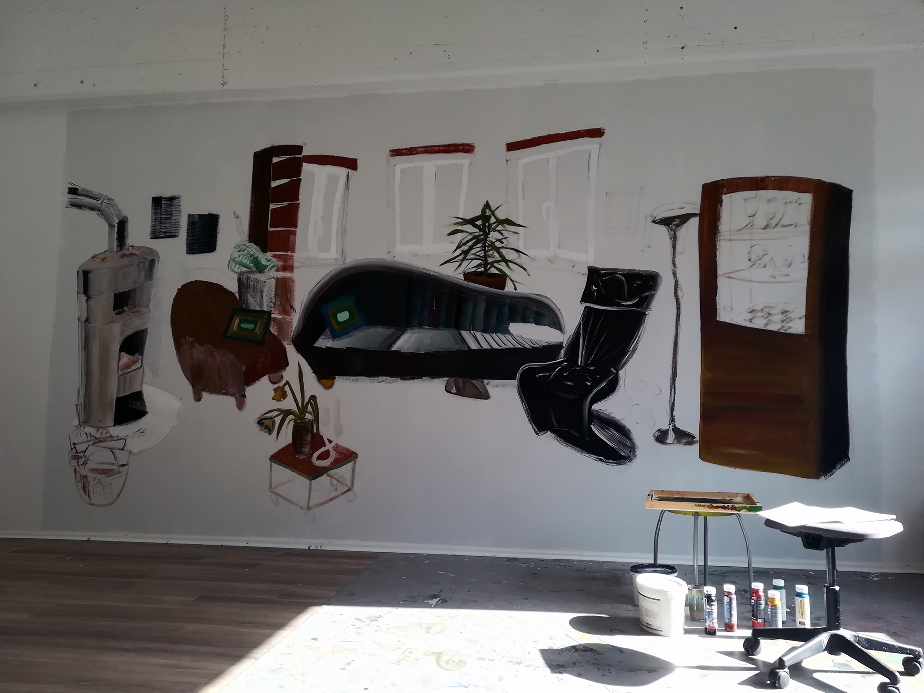Im Sommer 2024 malte Anna Bart ein Wandbild über zwei Etagen des Wohnhauses Achimer Straße 30. In besonderer Maltechnik bringt sie hier malerisch die Einrichtungsgegenstände der Hauseigentümer\*innen auf die Fassade.