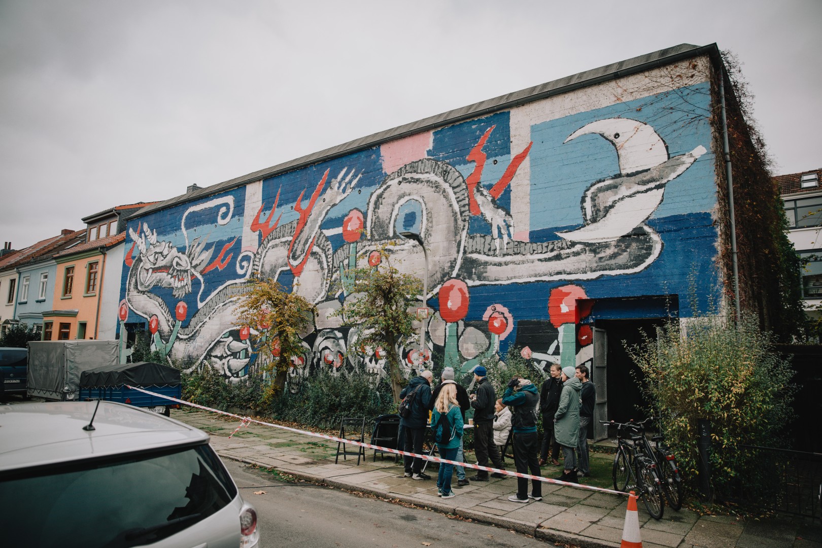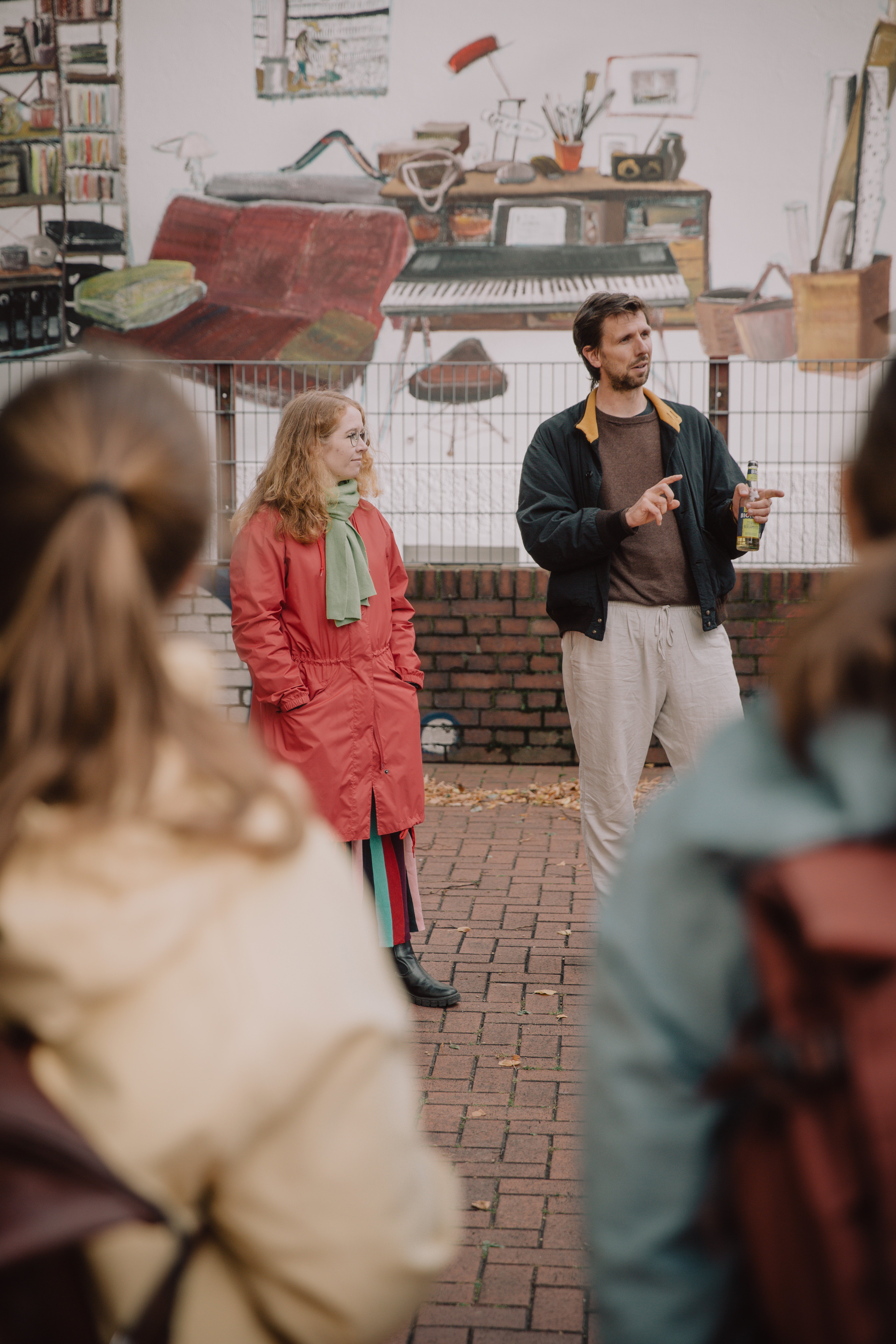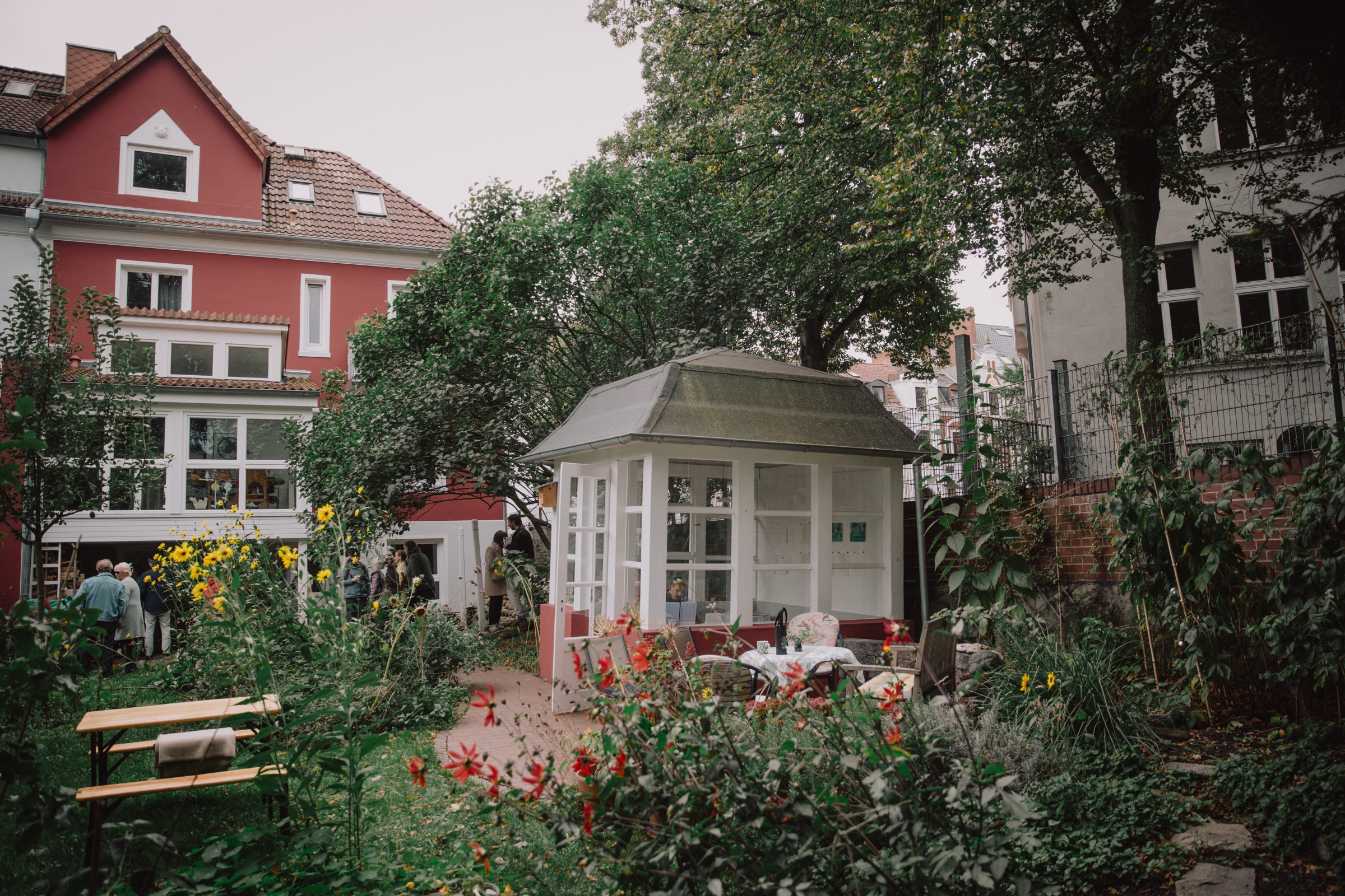 Zur Einweihung luden Anna Bart, Felix Dreesen und die Hausbesitzer\*innen interessierte Nachbar\*innen, Gäste und Kolleg\*innen zu Getränken und Kuchen in den Garten ein. Im Frisch restaurierten, historischen Gartenpavillon stellte Anna Bart Skizzen der Fassade sowie Arbeiten auf Papier aus.