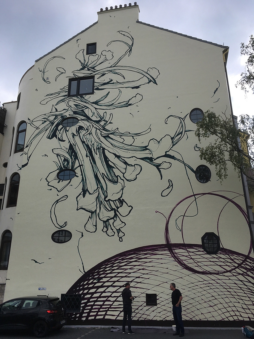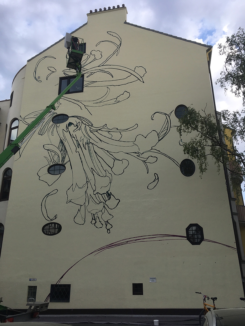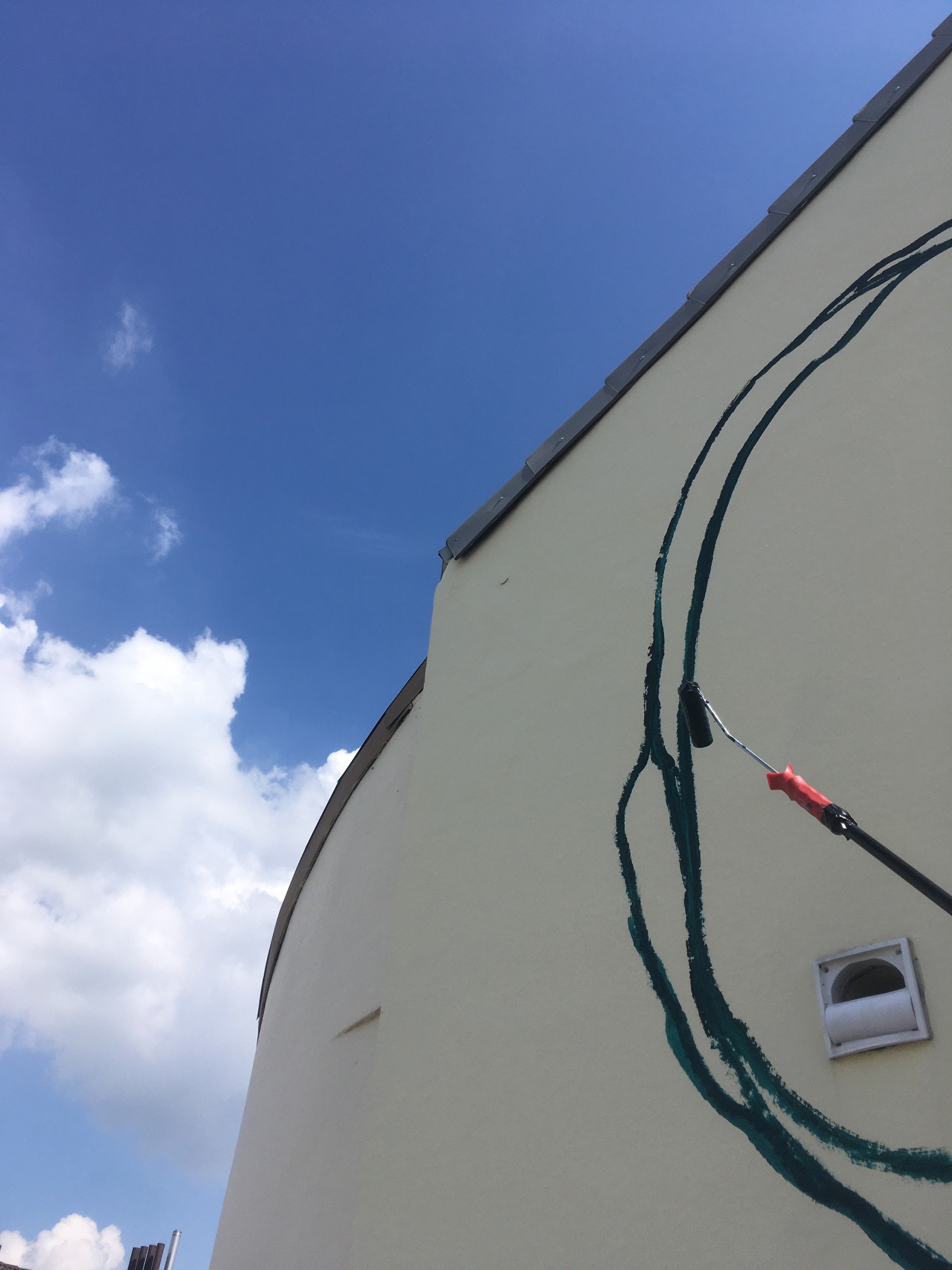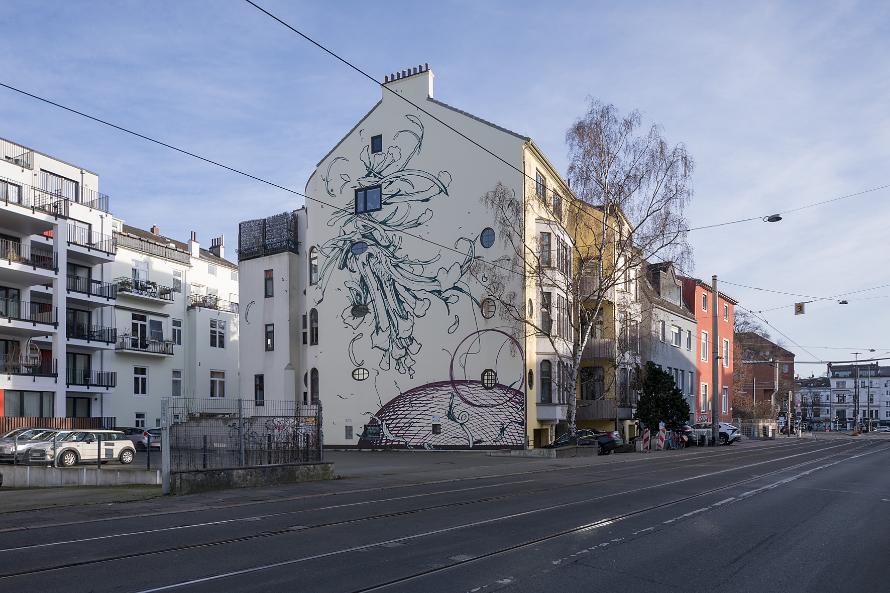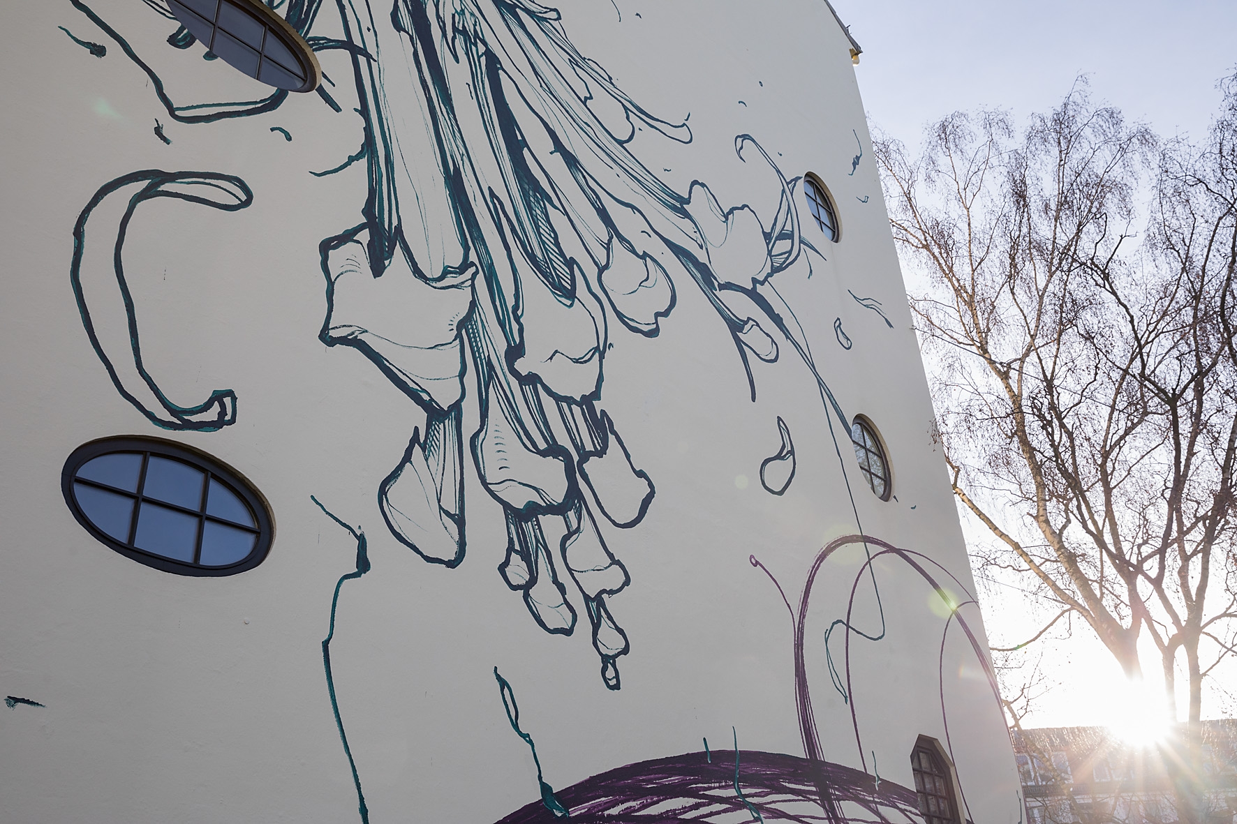 So entstand nach einer Phase der Annäherung und des Skizzierens innerhalb weniger Tage ein Werk, das aus der Distanz im Straßenraum ebenso funktioniert wie im unmittelbaren Nahblick. Bildlicher Ausgangspunkt für das Wandbild sind zwei kleine Studien: die Skizze des Fruchtkörpers eines Tannenzapfens und eine maschinell erzeugte Zeichnung in Rotationsbewegung. In zwei Farben auf die Fassade gebracht, verbinden sich die organischen Formen mit den in die Wand eingelassenen Fenstern und der ausgewachsenen Birke im Vorgarten des Hauses. Deren Äste werfen im Tages- und Jahresverlauf lange Schlagschatten auf die Wand. So bleibt das Bild im Zusammenspiel von Architektur, Umgebung und Licht in ständiger Bewegung.