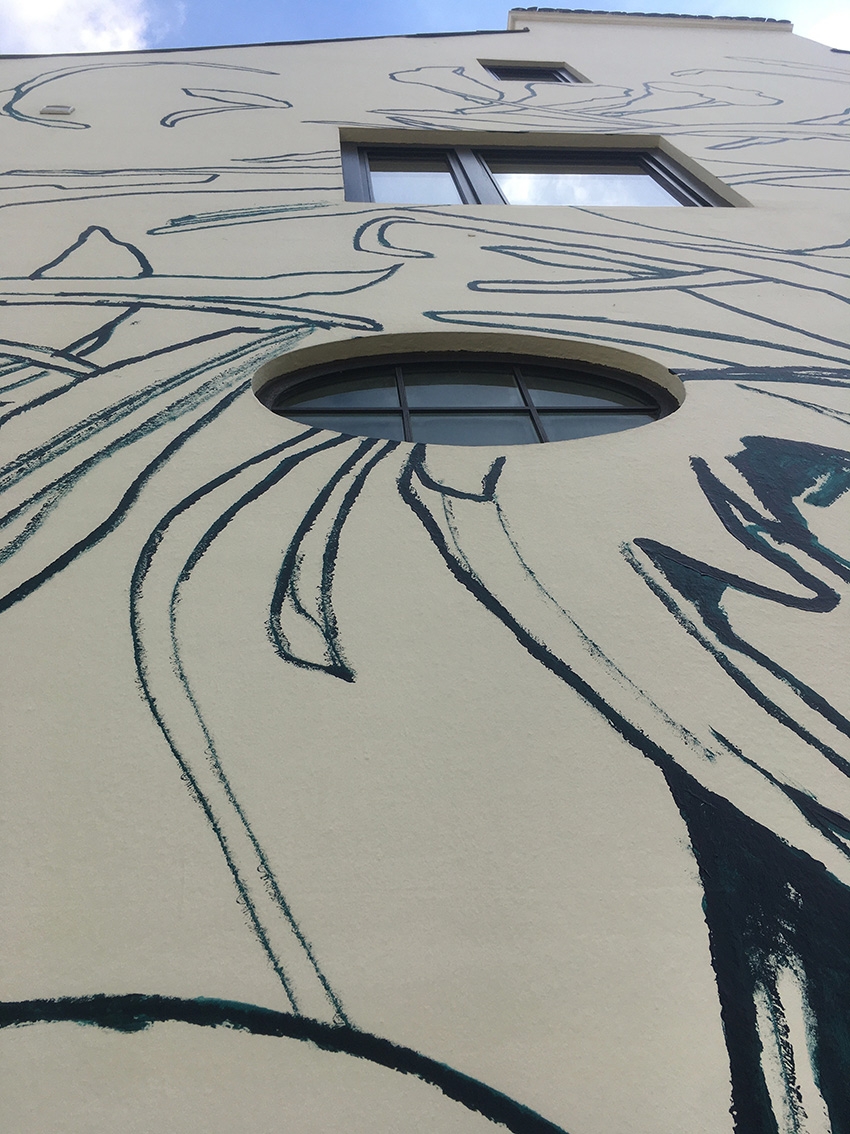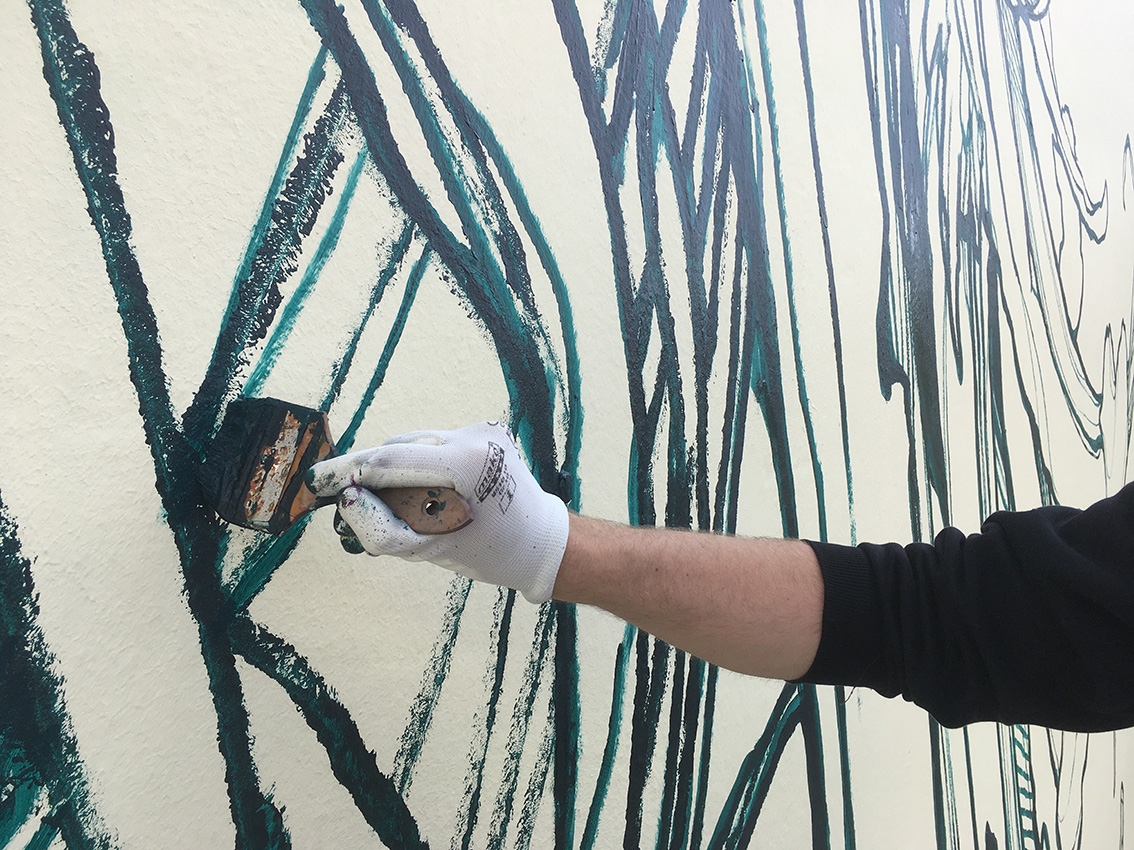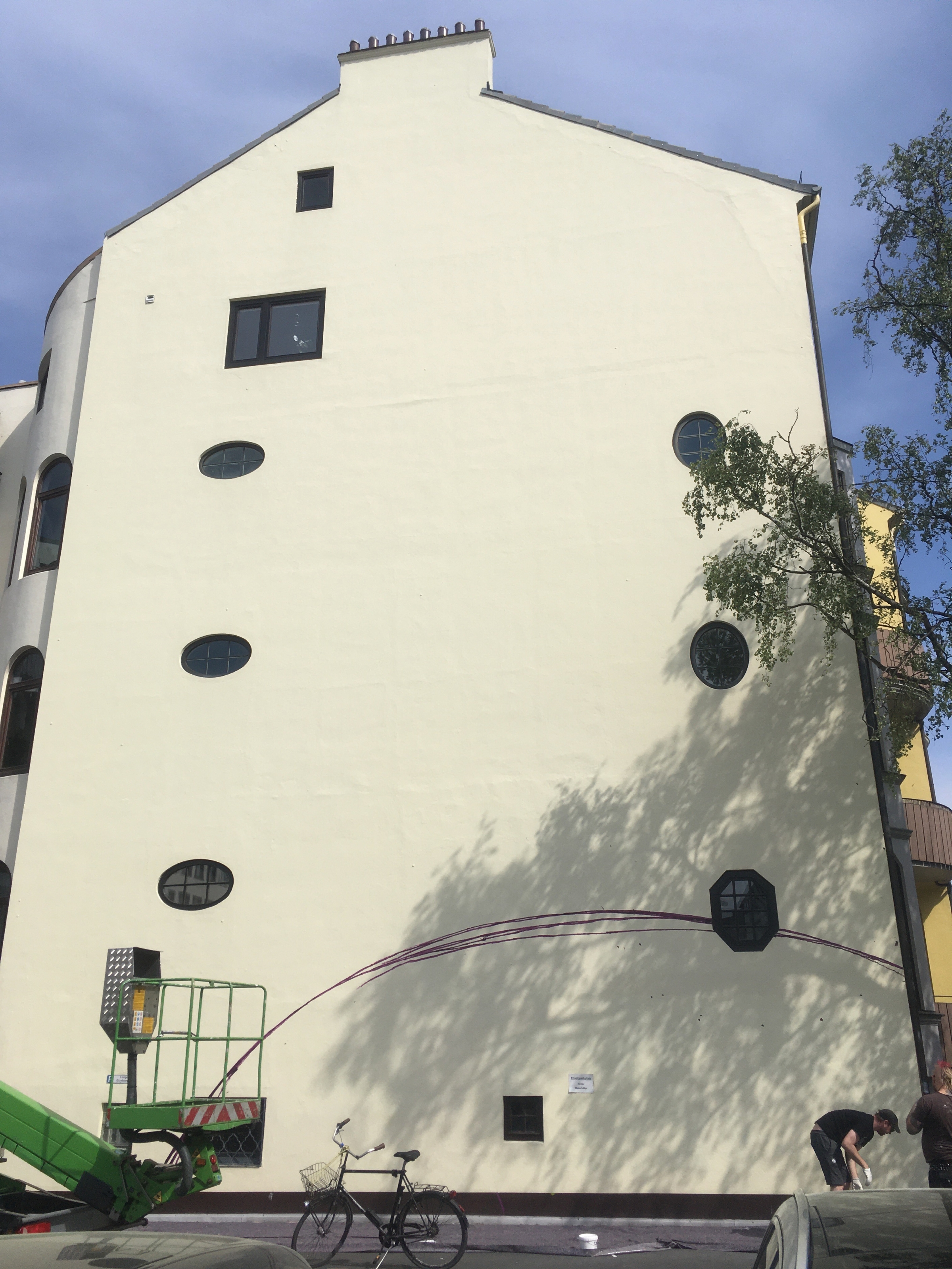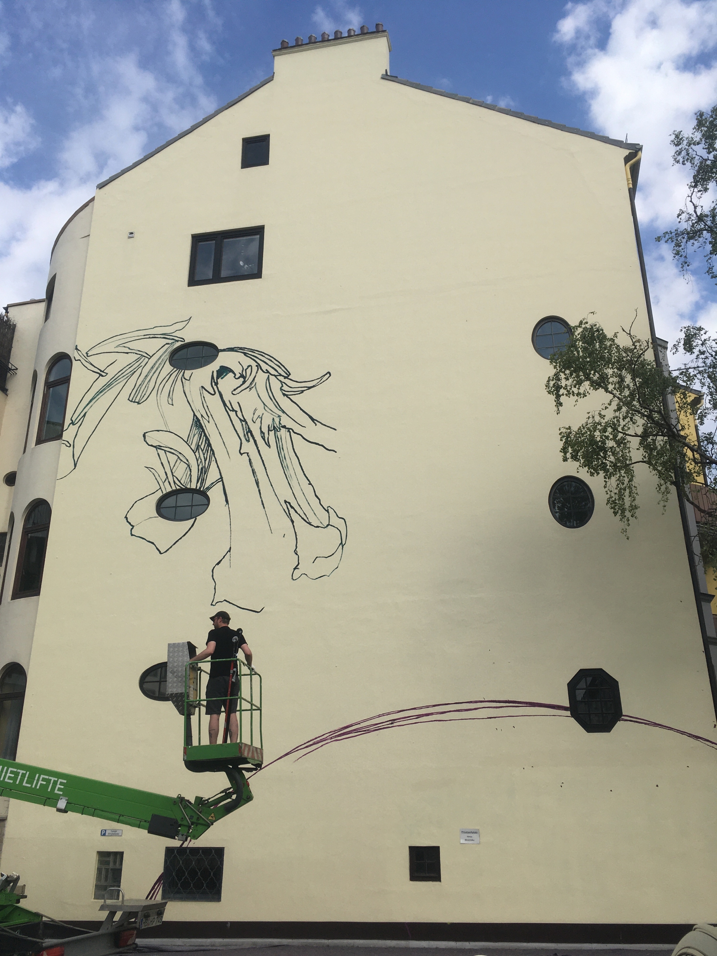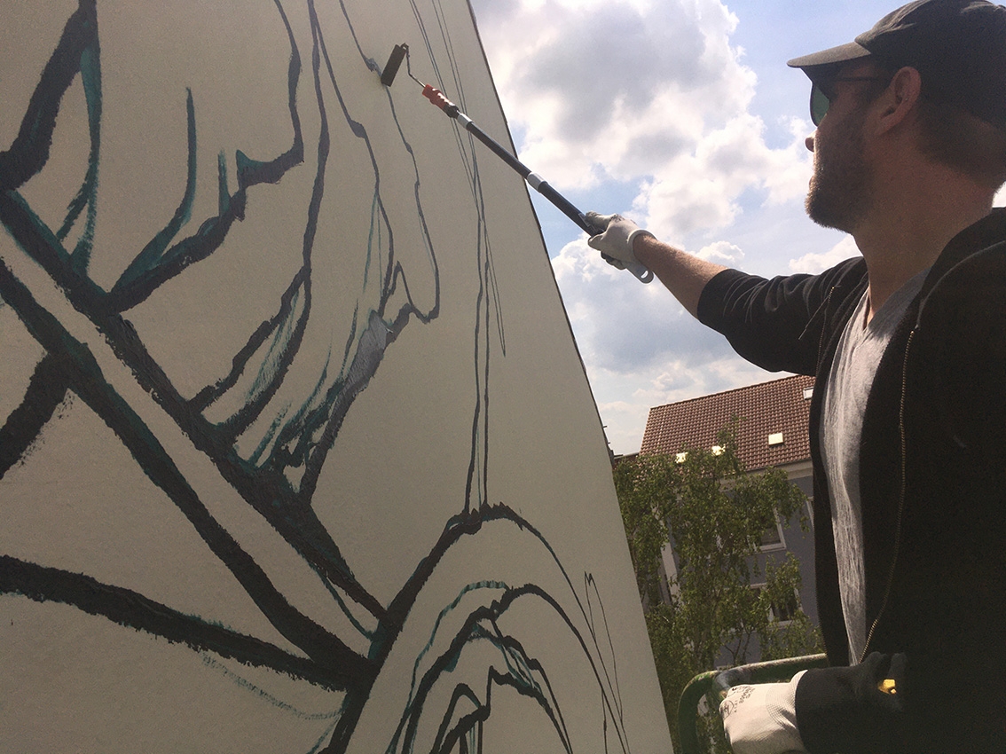 So entstand nach einer Phase der Annäherung und des Skizzierens innerhalb weniger Tage ein Werk, das aus der Distanz im Straßenraum ebenso funktioniert wie im unmittelbaren Nahblick. Bildlicher Ausgangspunkt für das Wandbild sind zwei kleine Studien: die Skizze des Fruchtkörpers eines Tannenzapfens und eine maschinell erzeugte Zeichnung in Rotationsbewegung. In zwei Farben auf die Fassade gebracht, verbinden sich die organischen Formen mit den in die Wand eingelassenen Fenstern und der ausgewachsenen Birke im Vorgarten des Hauses. Deren Äste werfen im Tages- und Jahresverlauf lange Schlagschatten auf die Wand. So bleibt das Bild im Zusammenspiel von Architektur, Umgebung und Licht in ständiger Bewegung.