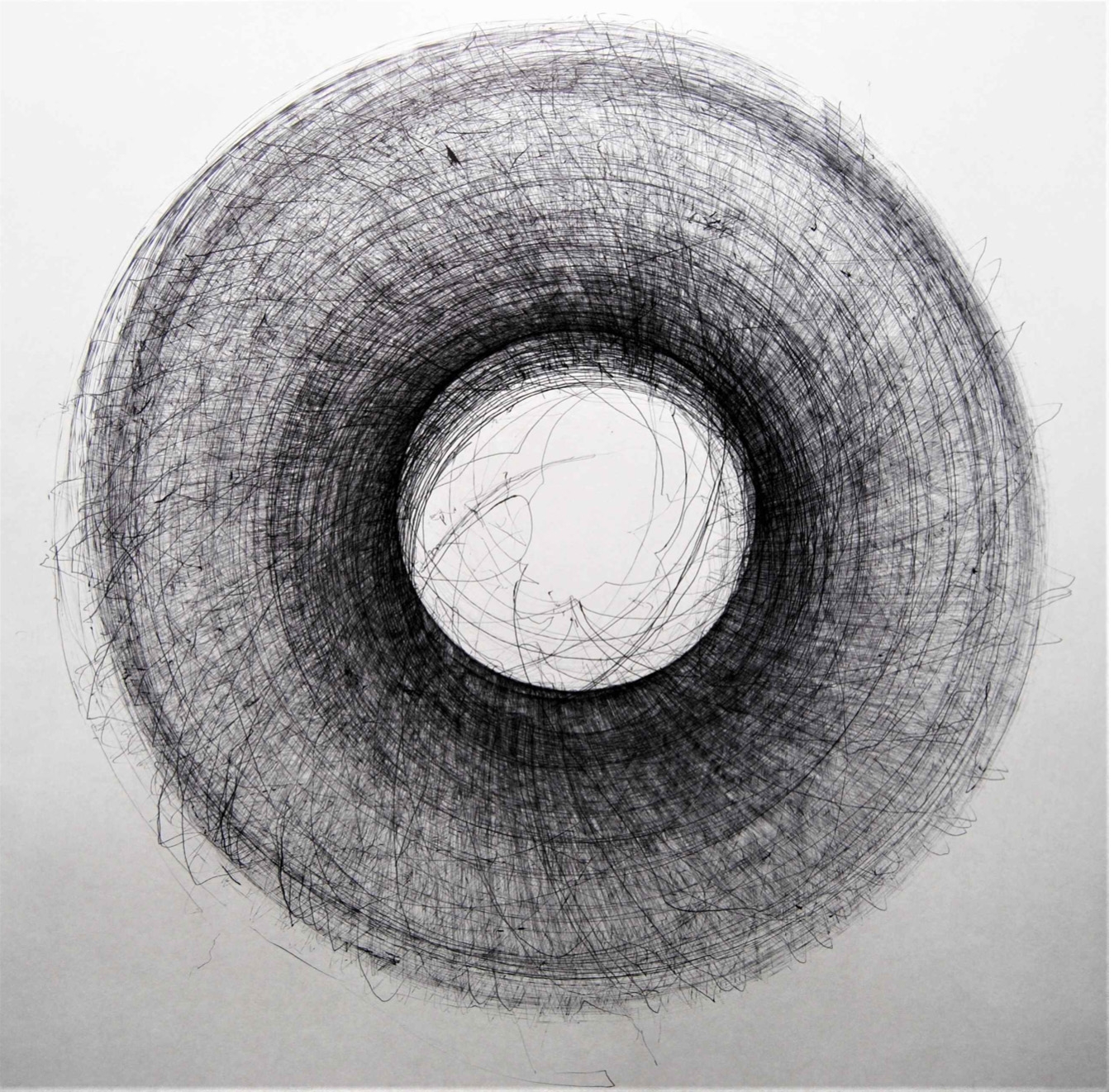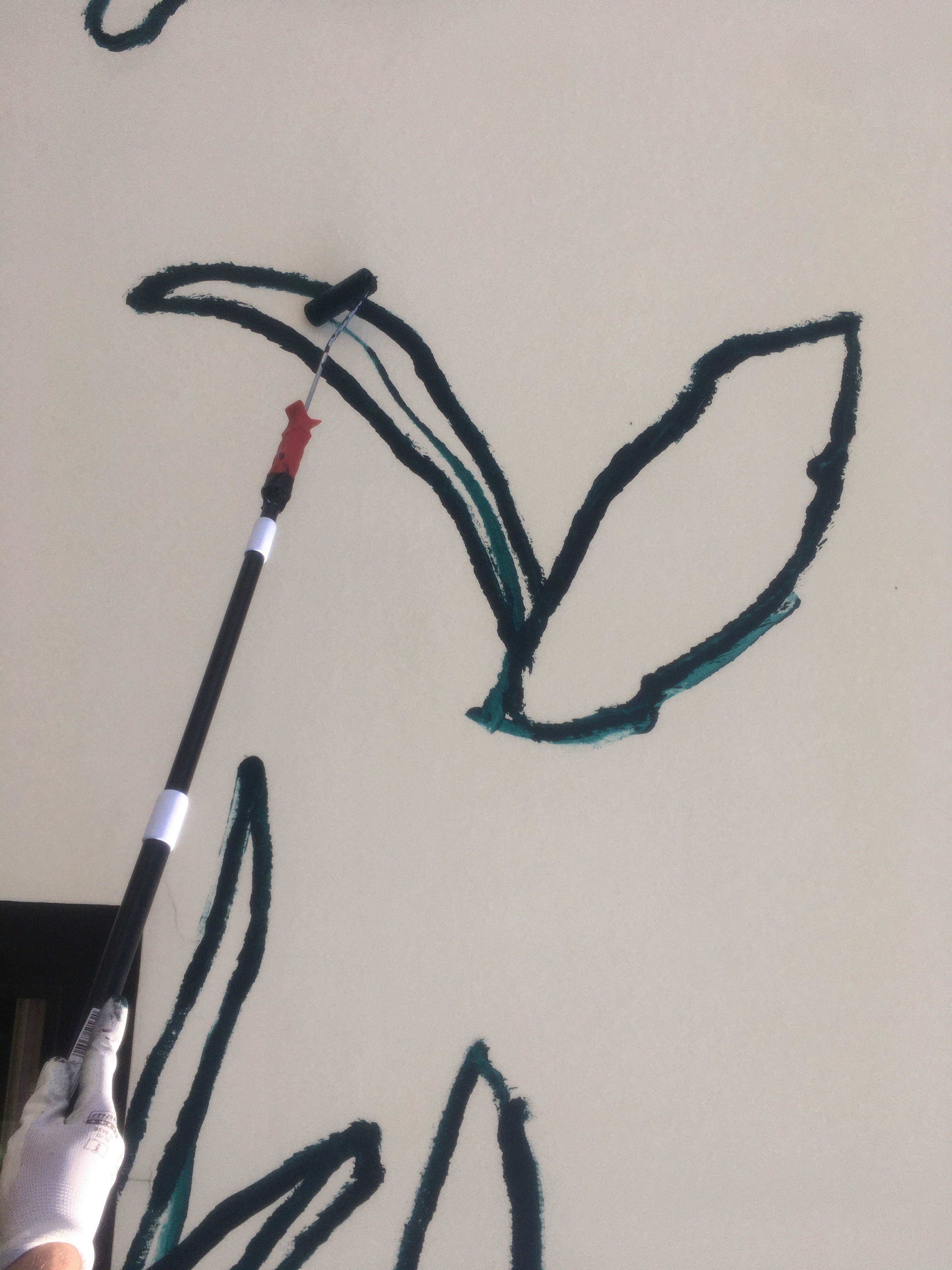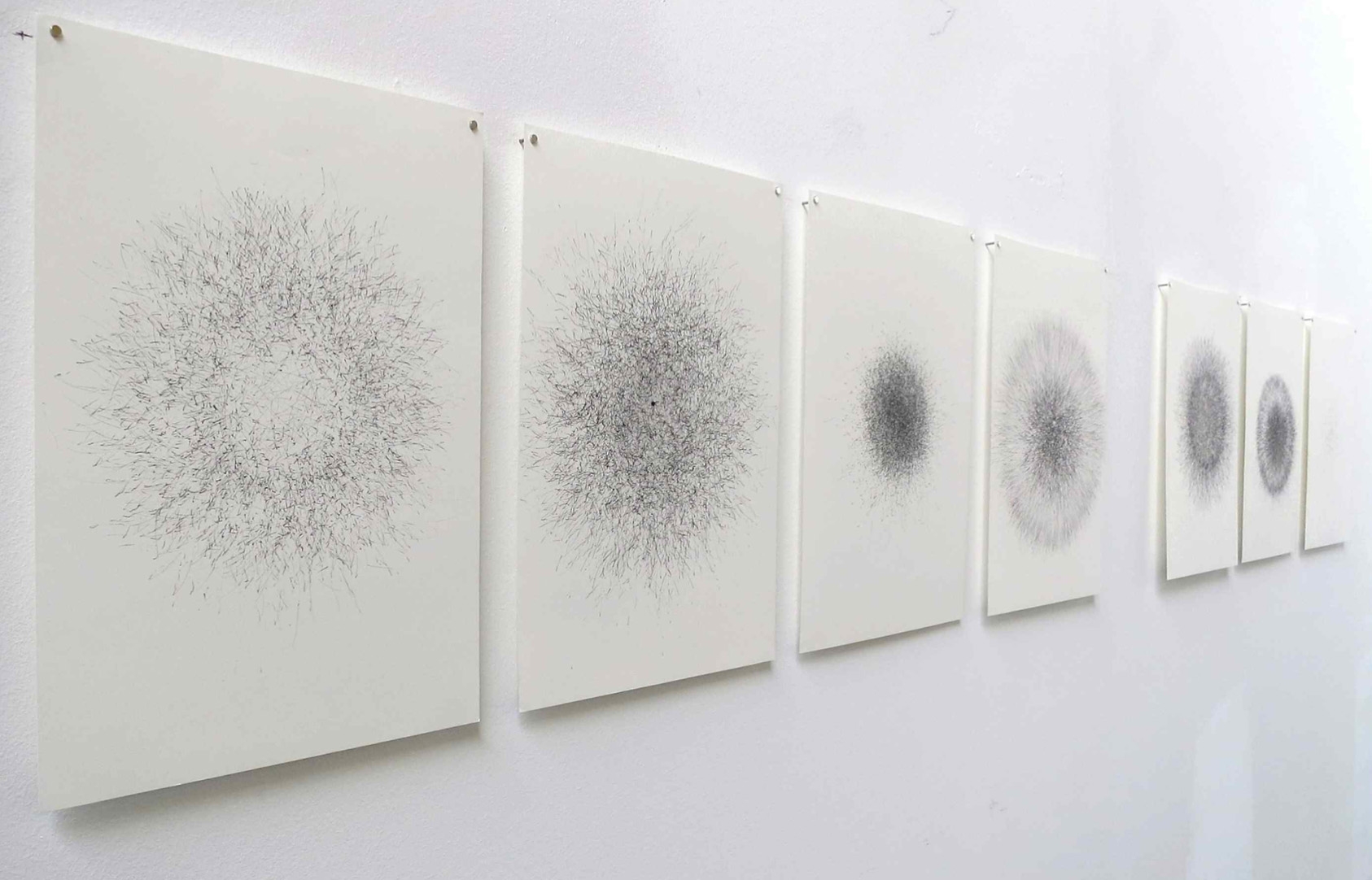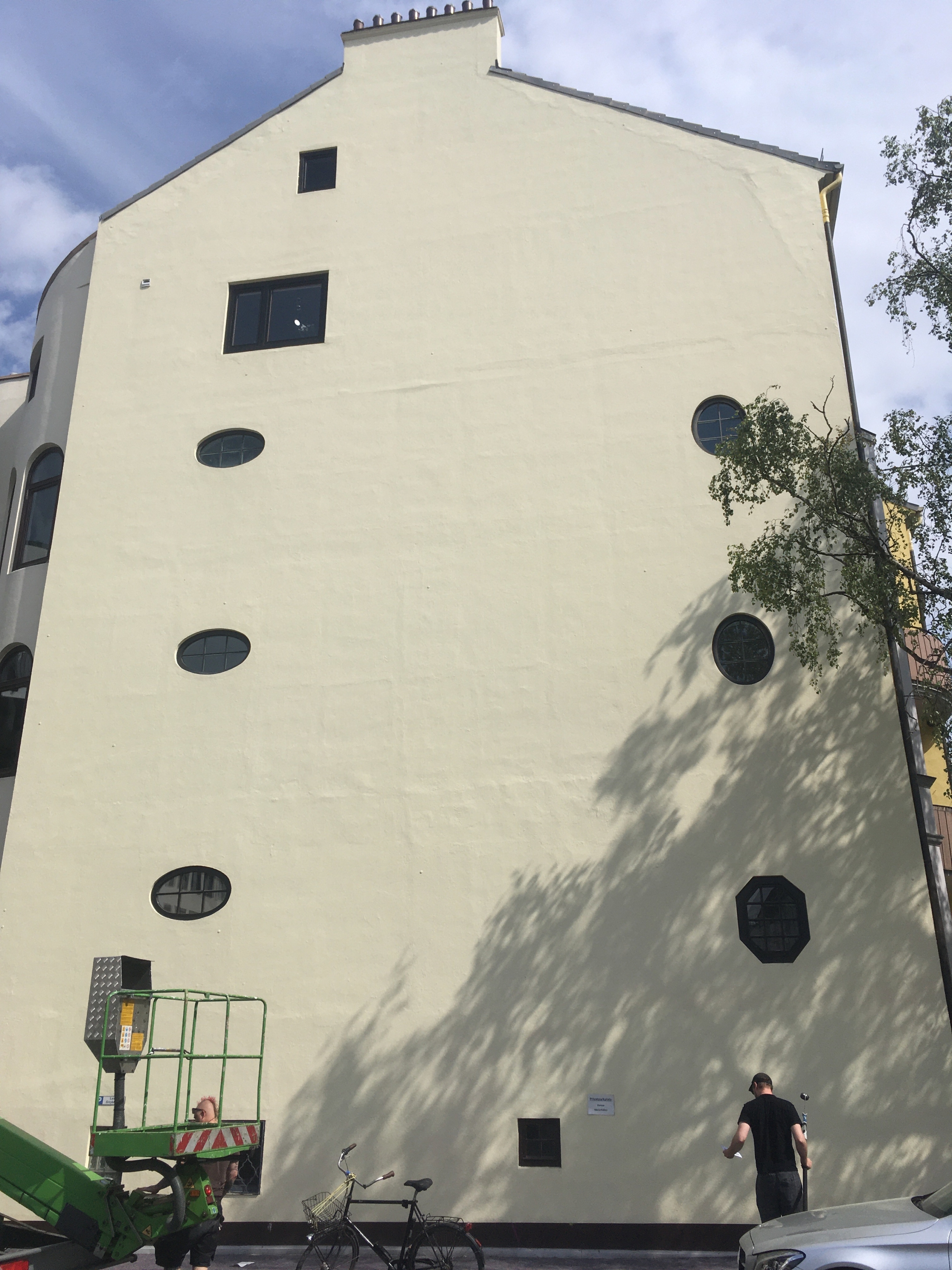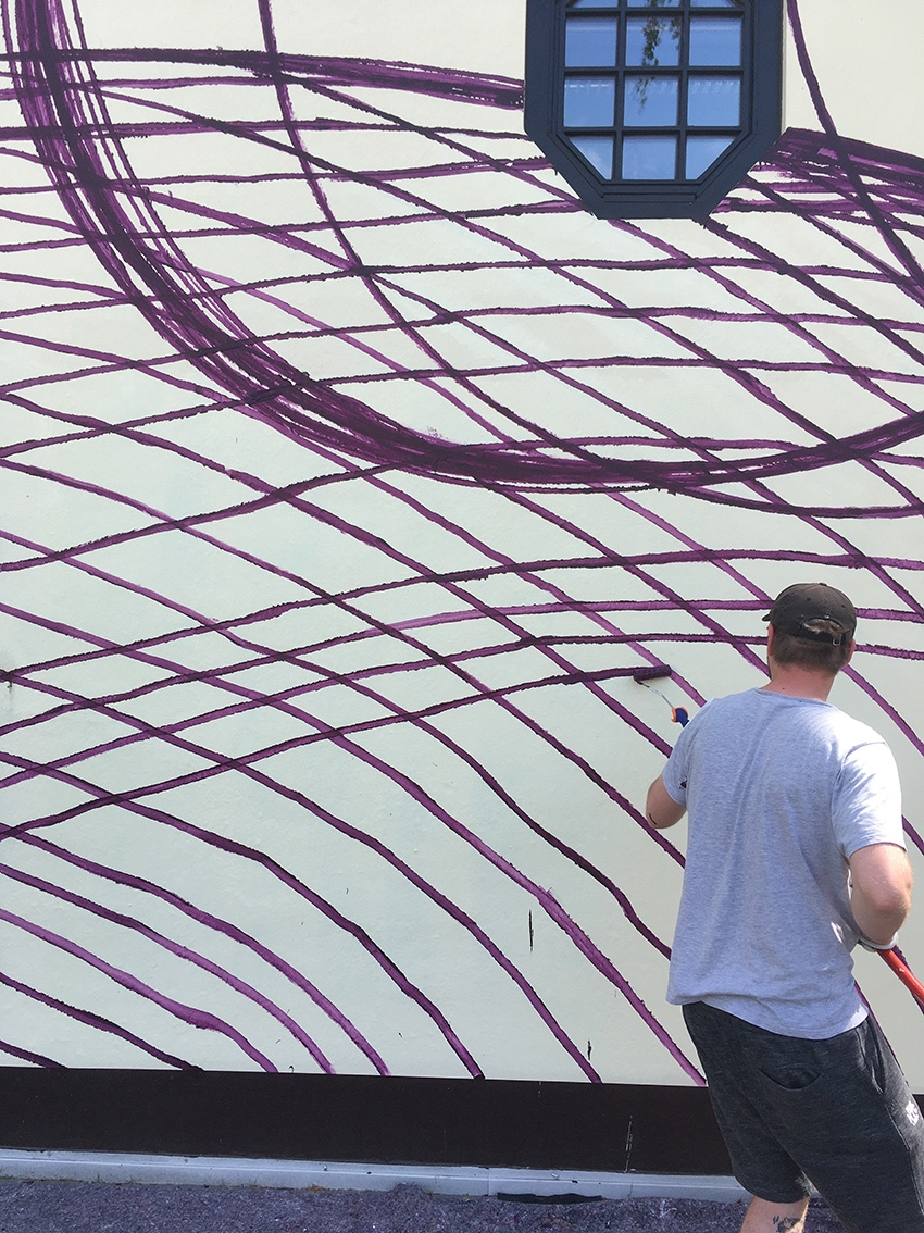 So entstand nach einer Phase der Annäherung und des Skizzierens innerhalb weniger Tage ein Werk, das aus der Distanz im Straßenraum ebenso funktioniert wie im unmittelbaren Nahblick. Bildlicher Ausgangspunkt für das Wandbild sind zwei kleine Studien: die Skizze des Fruchtkörpers eines Tannenzapfens und eine maschinell erzeugte Zeichnung in Rotationsbewegung. In zwei Farben auf die Fassade gebracht, verbinden sich die organischen Formen mit den in die Wand eingelassenen Fenstern und der ausgewachsenen Birke im Vorgarten des Hauses. Deren Äste werfen im Tages- und Jahresverlauf lange Schlagschatten auf die Wand. So bleibt das Bild im Zusammenspiel von Architektur, Umgebung und Licht in ständiger Bewegung.