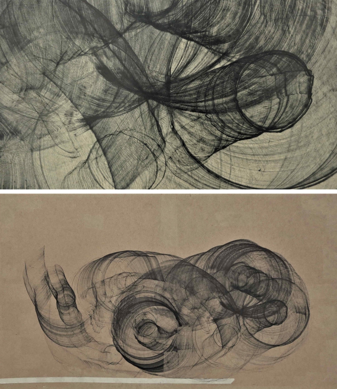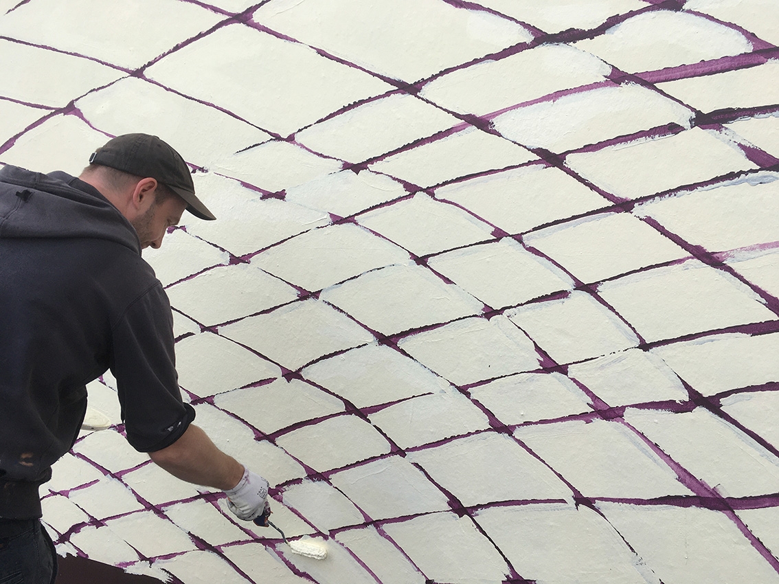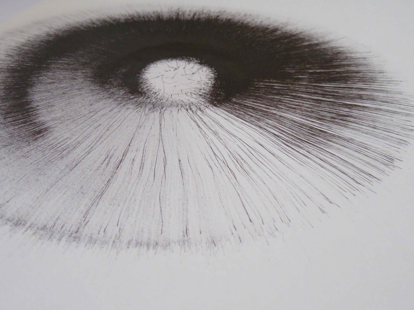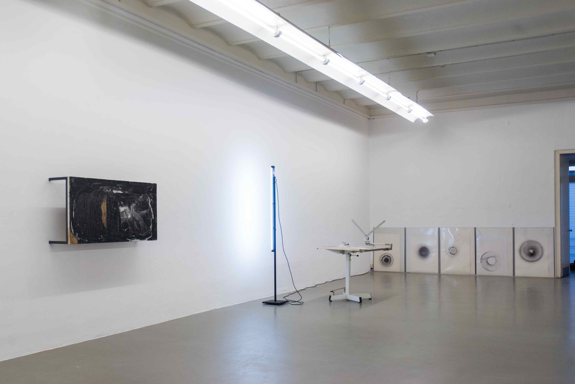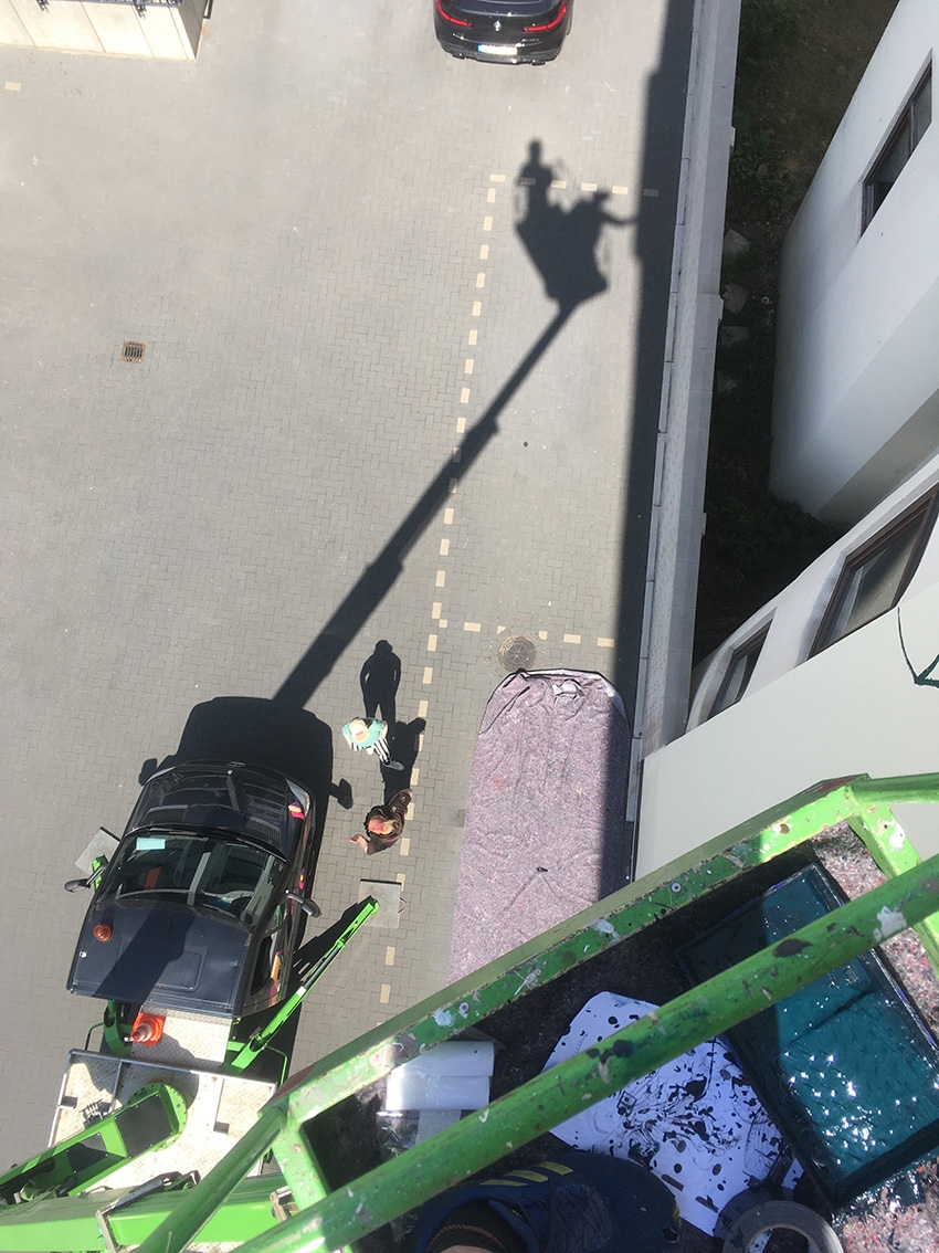 So entstand nach einer Phase der Annäherung und des Skizzierens innerhalb weniger Tage ein Werk, das aus der Distanz im Straßenraum ebenso funktioniert wie im unmittelbaren Nahblick. Bildlicher Ausgangspunkt für das Wandbild sind zwei kleine Studien: die Skizze des Fruchtkörpers eines Tannenzapfens und eine maschinell erzeugte Zeichnung in Rotationsbewegung. In zwei Farben auf die Fassade gebracht, verbinden sich die organischen Formen mit den in die Wand eingelassenen Fenstern und der ausgewachsenen Birke im Vorgarten des Hauses. Deren Äste werfen im Tages- und Jahresverlauf lange Schlagschatten auf die Wand. So bleibt das Bild im Zusammenspiel von Architektur, Umgebung und Licht in ständiger Bewegung.