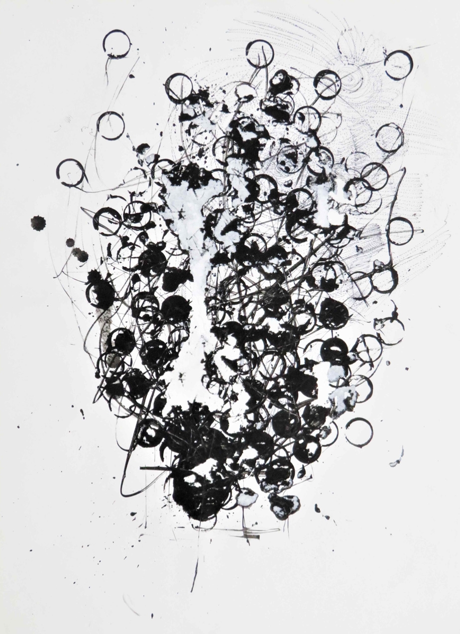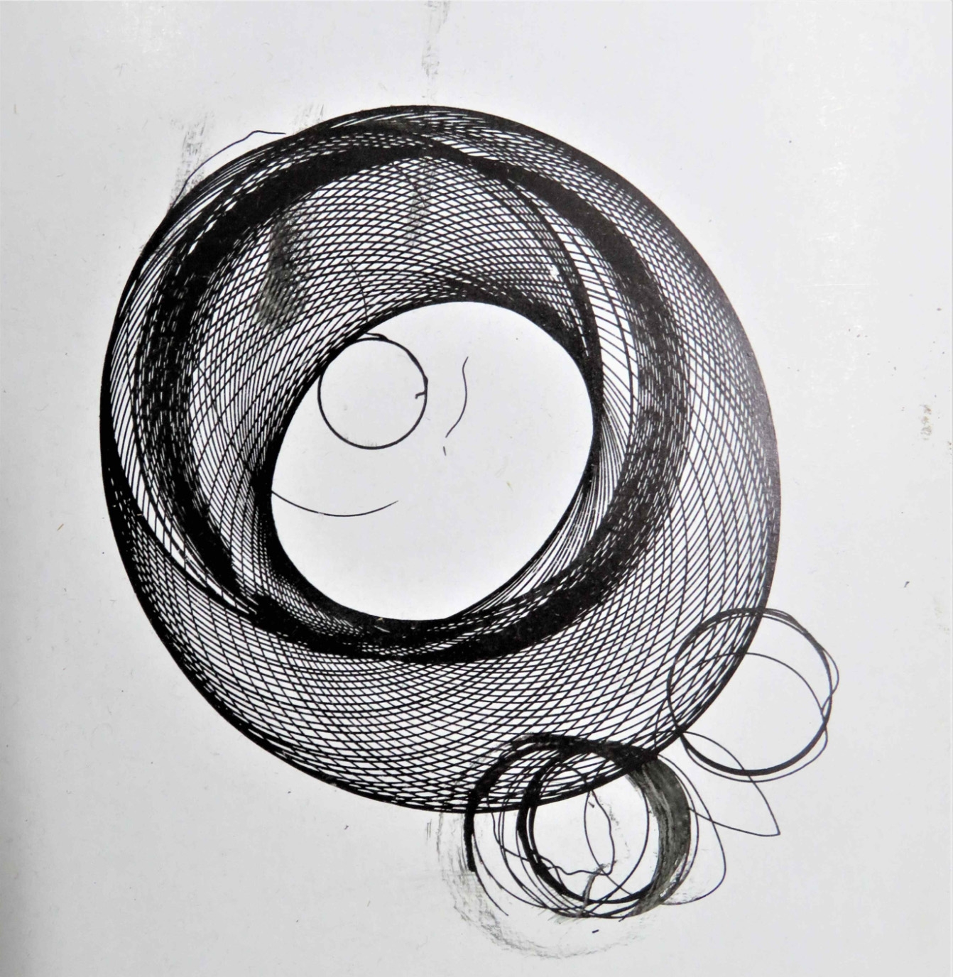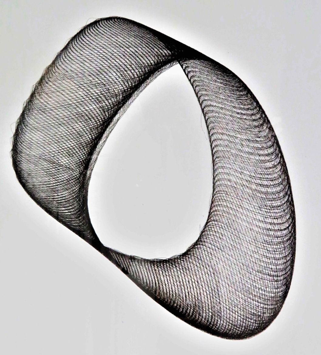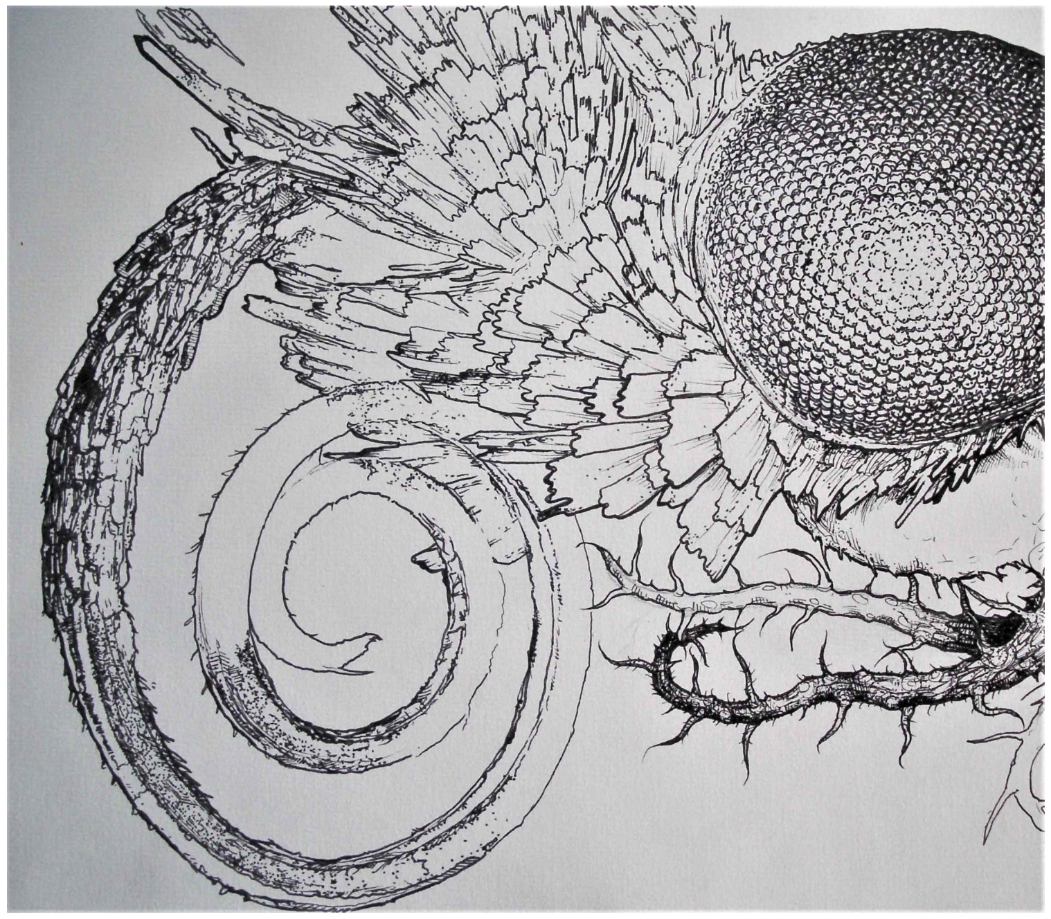 So entstand nach einer Phase der Annäherung und des Skizzierens innerhalb weniger Tage ein Werk, das aus der Distanz im Straßenraum ebenso funktioniert wie im unmittelbaren Nahblick. Bildlicher Ausgangspunkt für das Wandbild sind zwei kleine Studien: die Skizze des Fruchtkörpers eines Tannenzapfens und eine maschinell erzeugte Zeichnung in Rotationsbewegung. In zwei Farben auf die Fassade gebracht, verbinden sich die organischen Formen mit den in die Wand eingelassenen Fenstern und der ausgewachsenen Birke im Vorgarten des Hauses. Deren Äste werfen im Tages- und Jahresverlauf lange Schlagschatten auf die Wand. So bleibt das Bild im Zusammenspiel von Architektur, Umgebung und Licht in ständiger Bewegung.