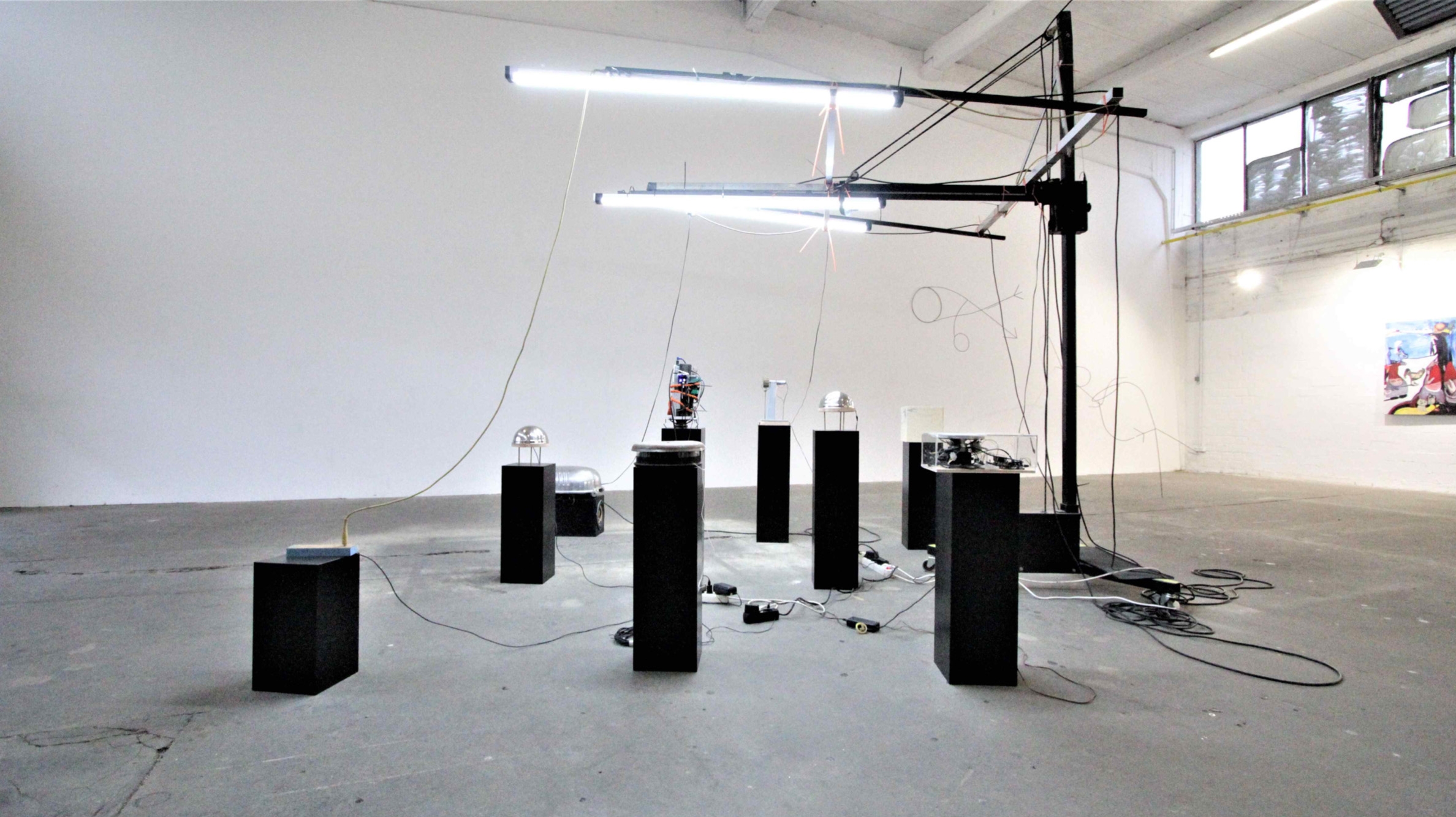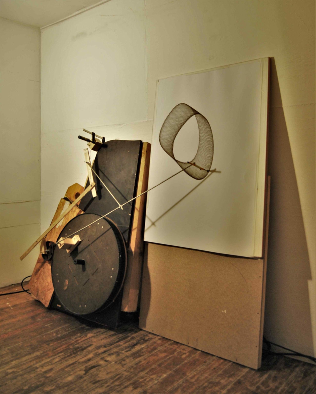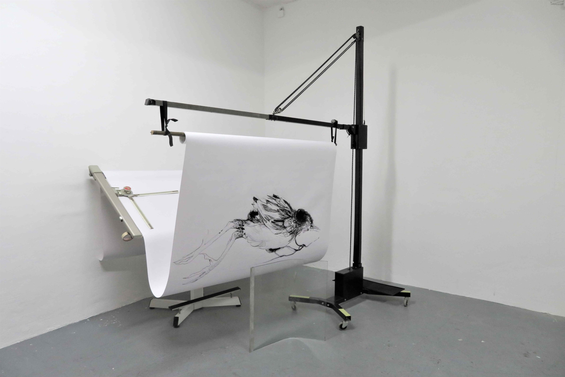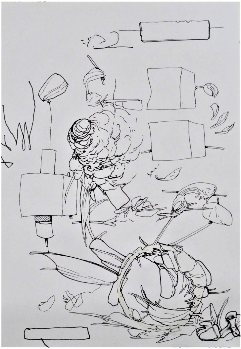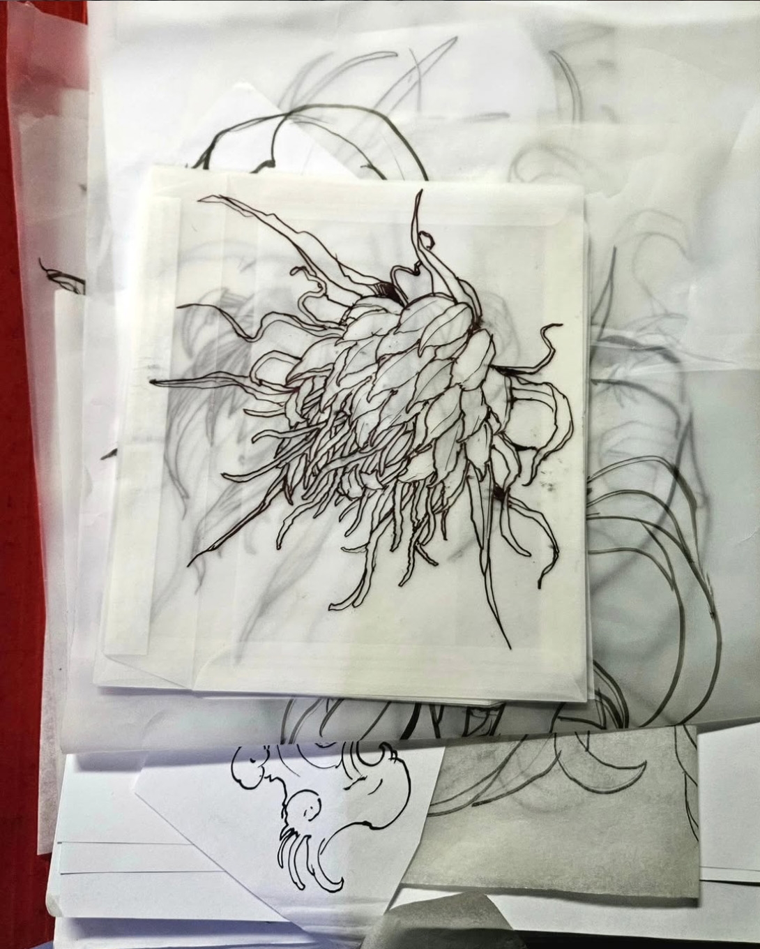 So entstand nach einer Phase der Annäherung und des Skizzierens innerhalb weniger Tage ein Werk, das aus der Distanz im Straßenraum ebenso funktioniert wie im unmittelbaren Nahblick. Bildlicher Ausgangspunkt für das Wandbild sind zwei kleine Studien: die Skizze des Fruchtkörpers eines Tannenzapfens und eine maschinell erzeugte Zeichnung in Rotationsbewegung. In zwei Farben auf die Fassade gebracht, verbinden sich die organischen Formen mit den in die Wand eingelassenen Fenstern und der ausgewachsenen Birke im Vorgarten des Hauses. Deren Äste werfen im Tages- und Jahresverlauf lange Schlagschatten auf die Wand. So bleibt das Bild im Zusammenspiel von Architektur, Umgebung und Licht in ständiger Bewegung.