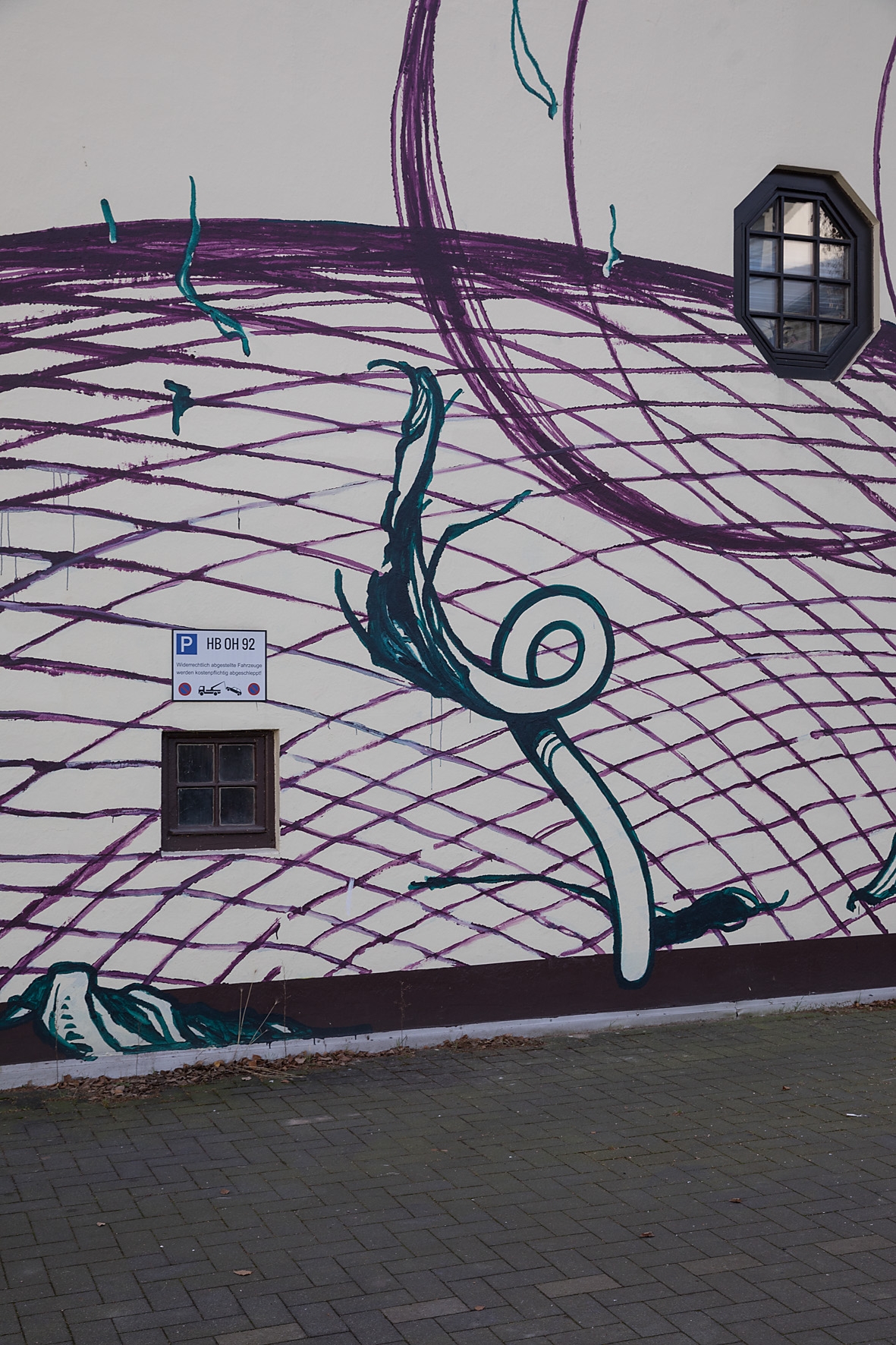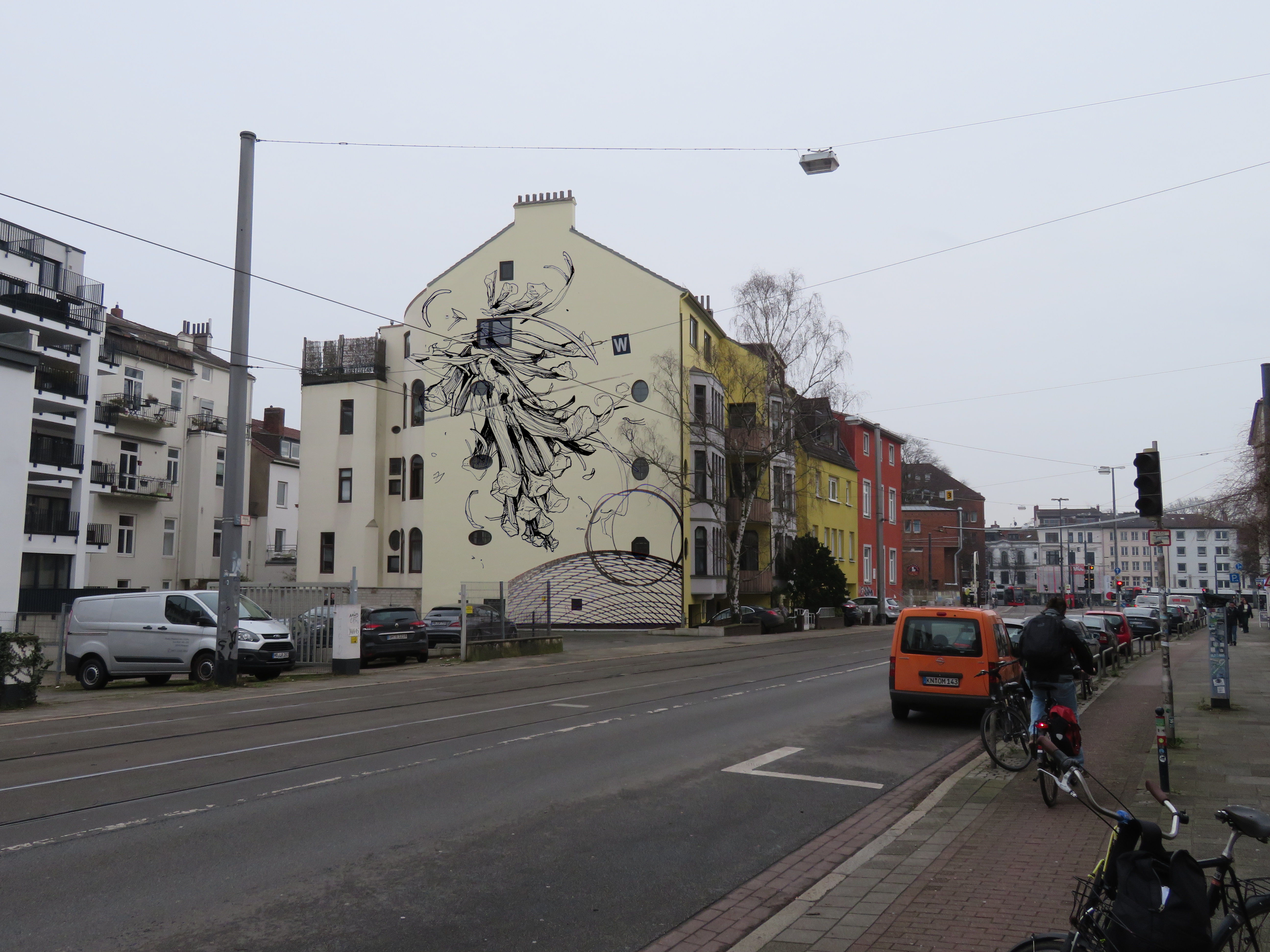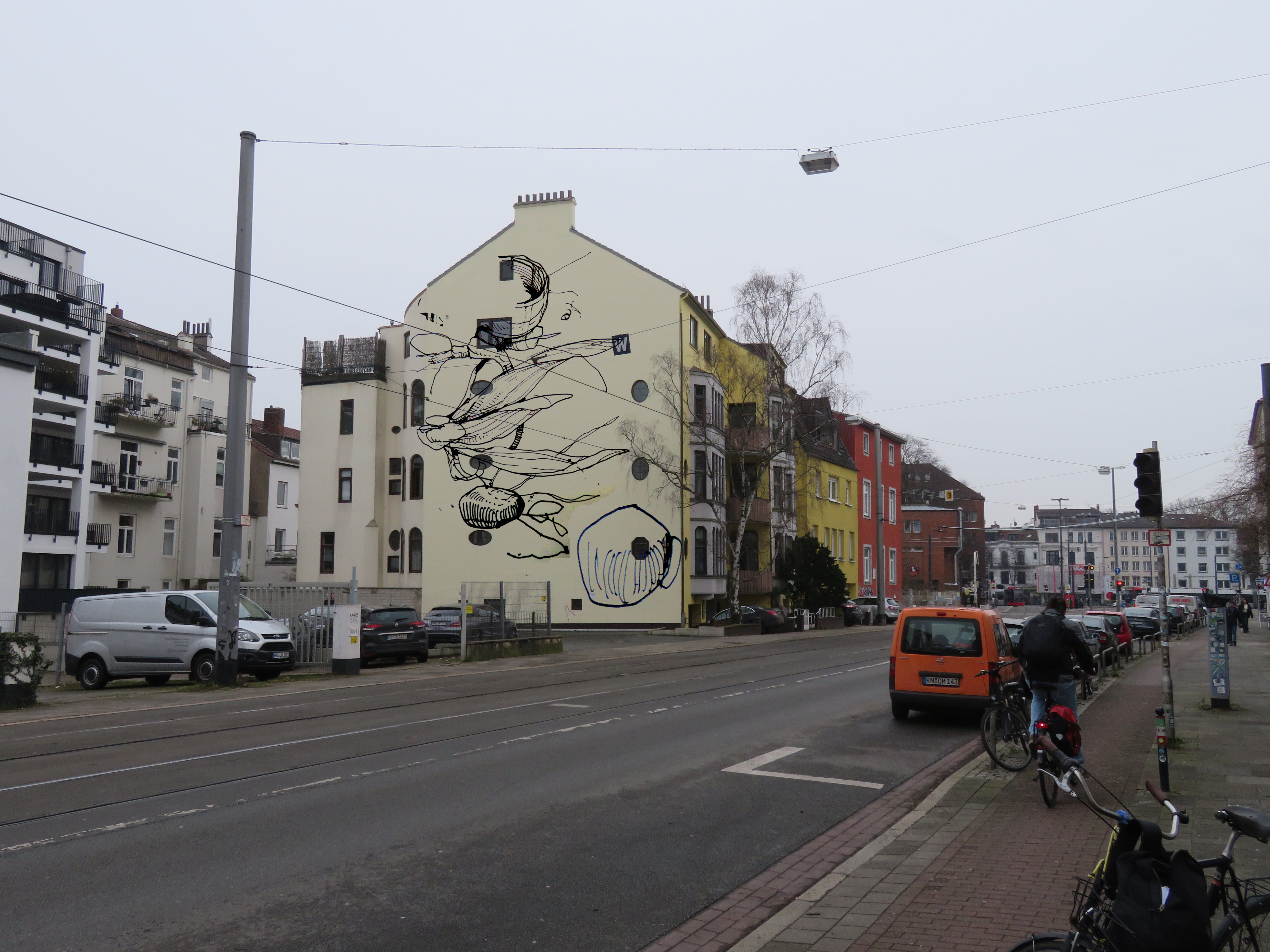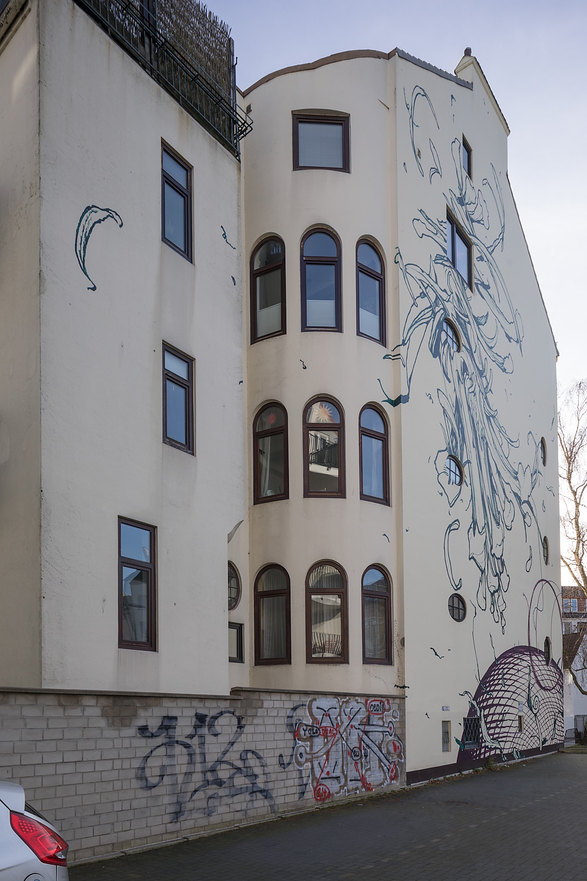 An der Fassade am Dobben 149 realisierte Hannes Middelberg eines seiner ersten Wandbilder – und bis heute sein größtes. Normalerweise in einer darstellenden wie auch experimentell abstrakten und seriellen Zeichenpraxis zwischen händischer und maschineller Arbeit sowie dem Tätowieren im Studio verortet, übertrug er seine Erfahrungen des Zeichnens und Tätowierens auf dem menschlichen Körper nun auf die monumentale Fläche der Hauswand.