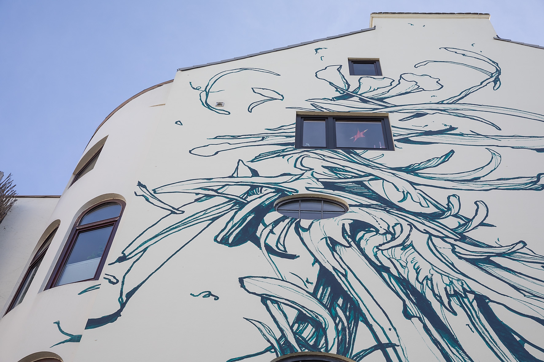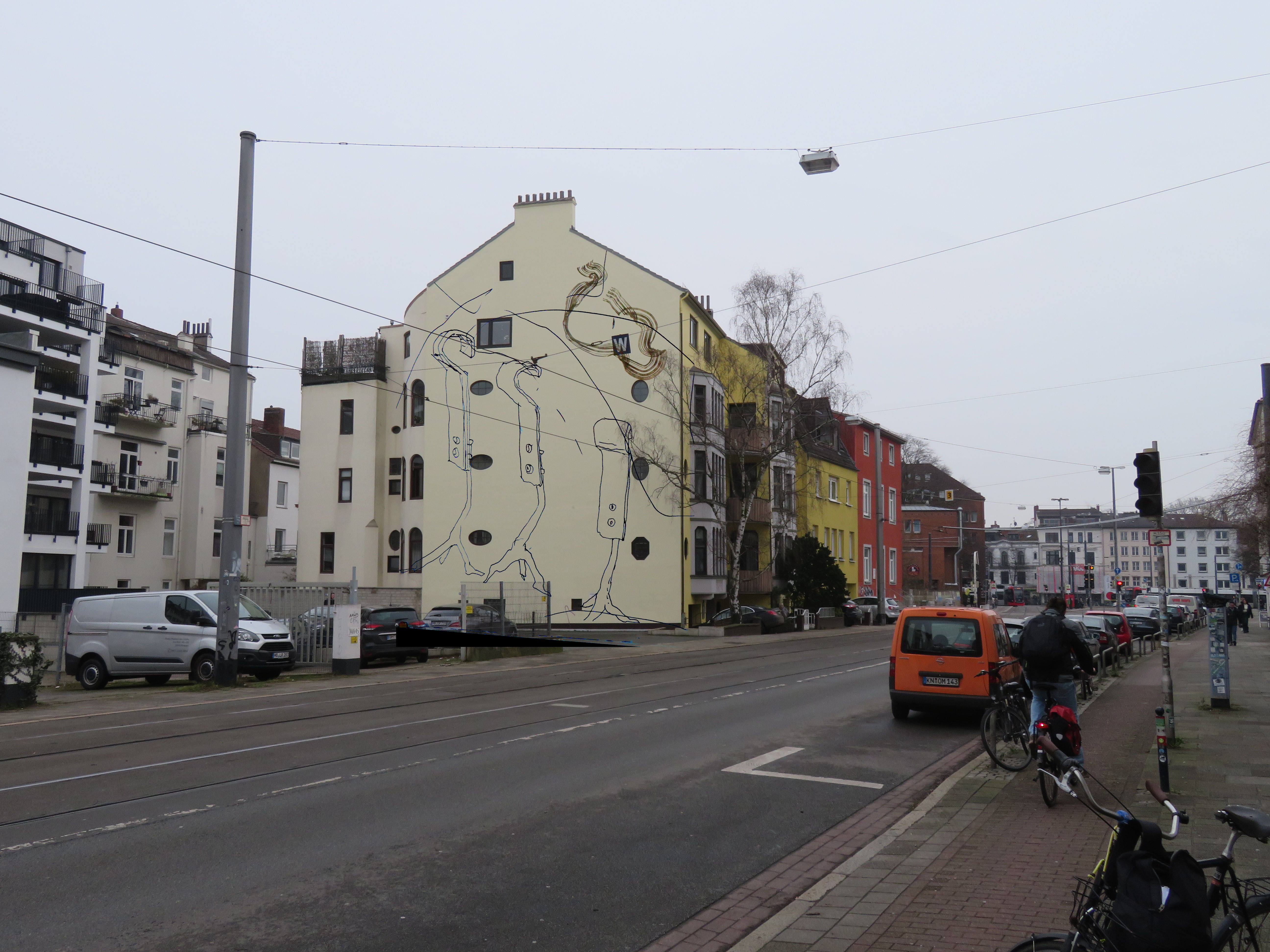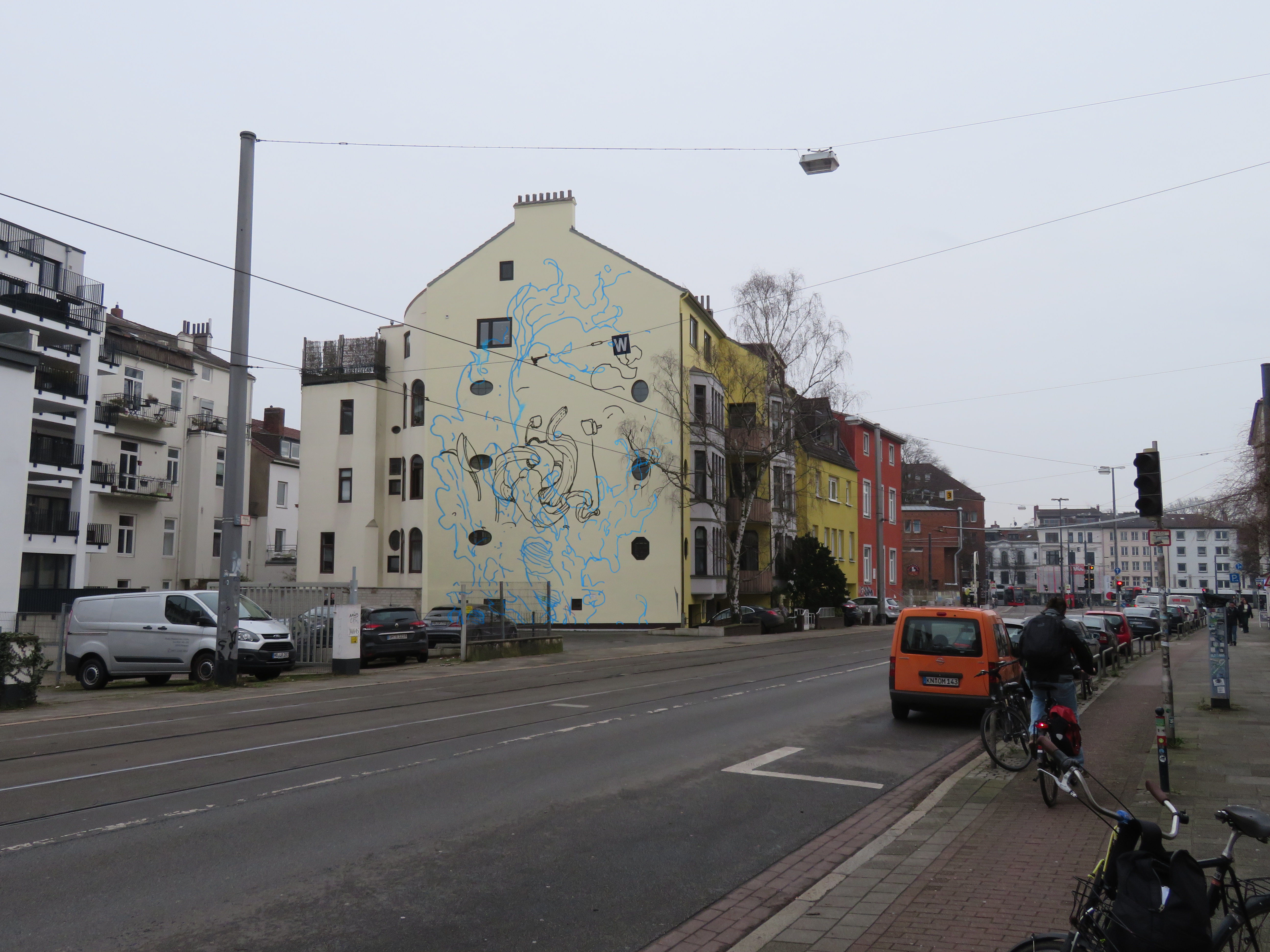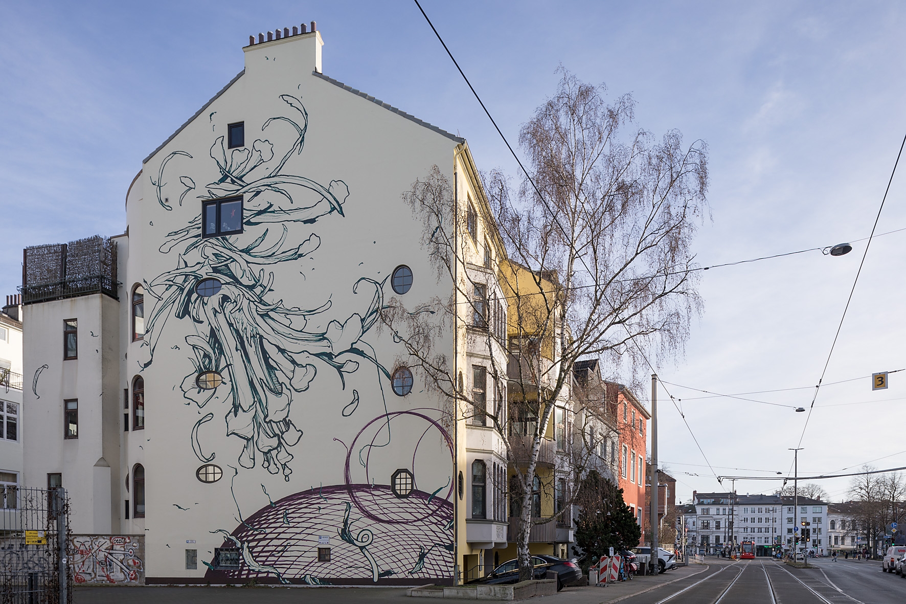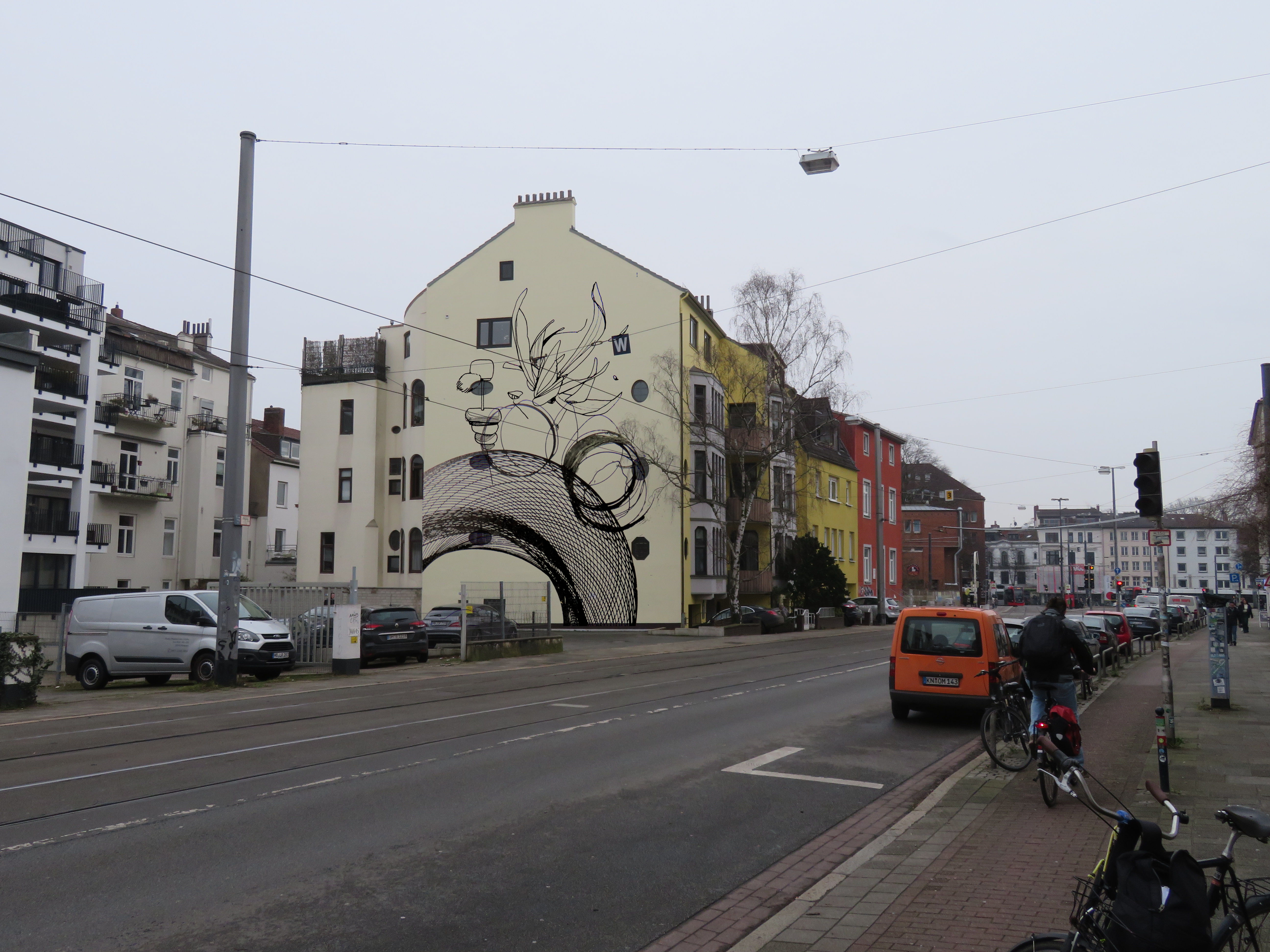 An der Fassade am Dobben 149 realisierte Hannes Middelberg eines seiner ersten Wandbilder – und bis heute sein größtes. Normalerweise in einer darstellenden wie auch experimentell abstrakten und seriellen Zeichenpraxis zwischen händischer und maschineller Arbeit sowie dem Tätowieren im Studio verortet, übertrug er seine Erfahrungen des Zeichnens und Tätowierens auf dem menschlichen Körper nun auf die monumentale Fläche der Hauswand.