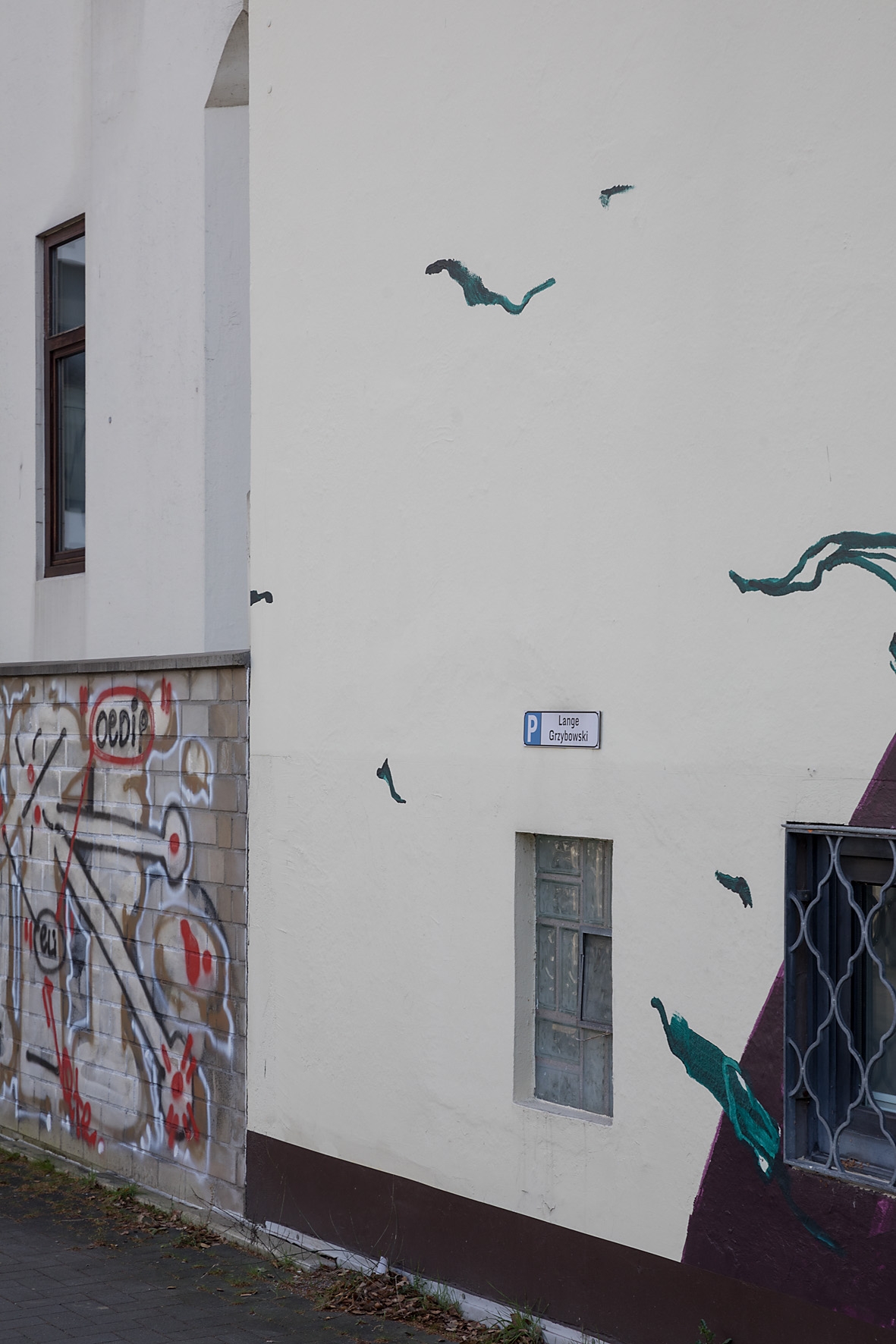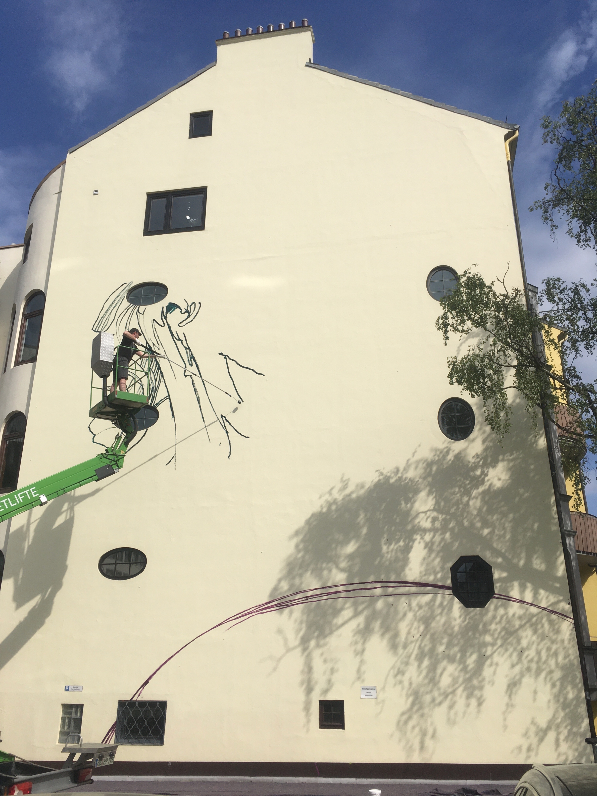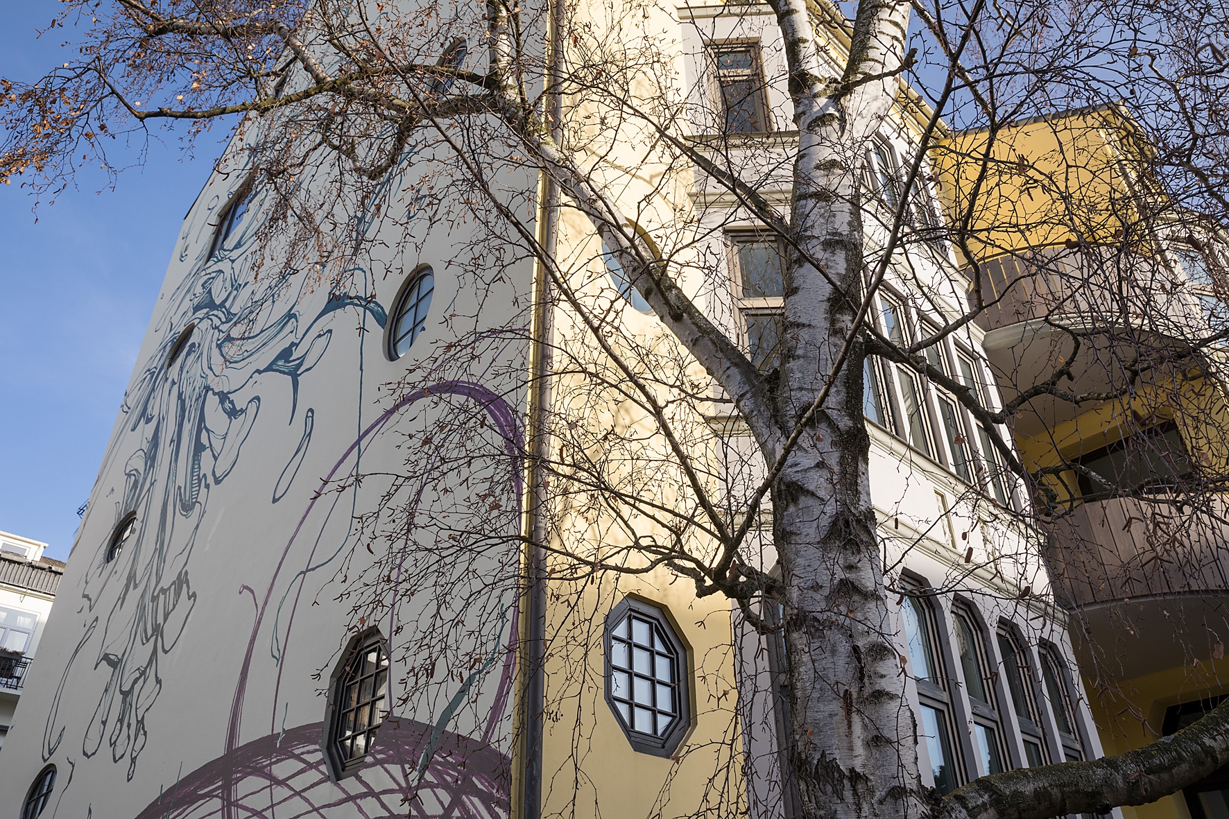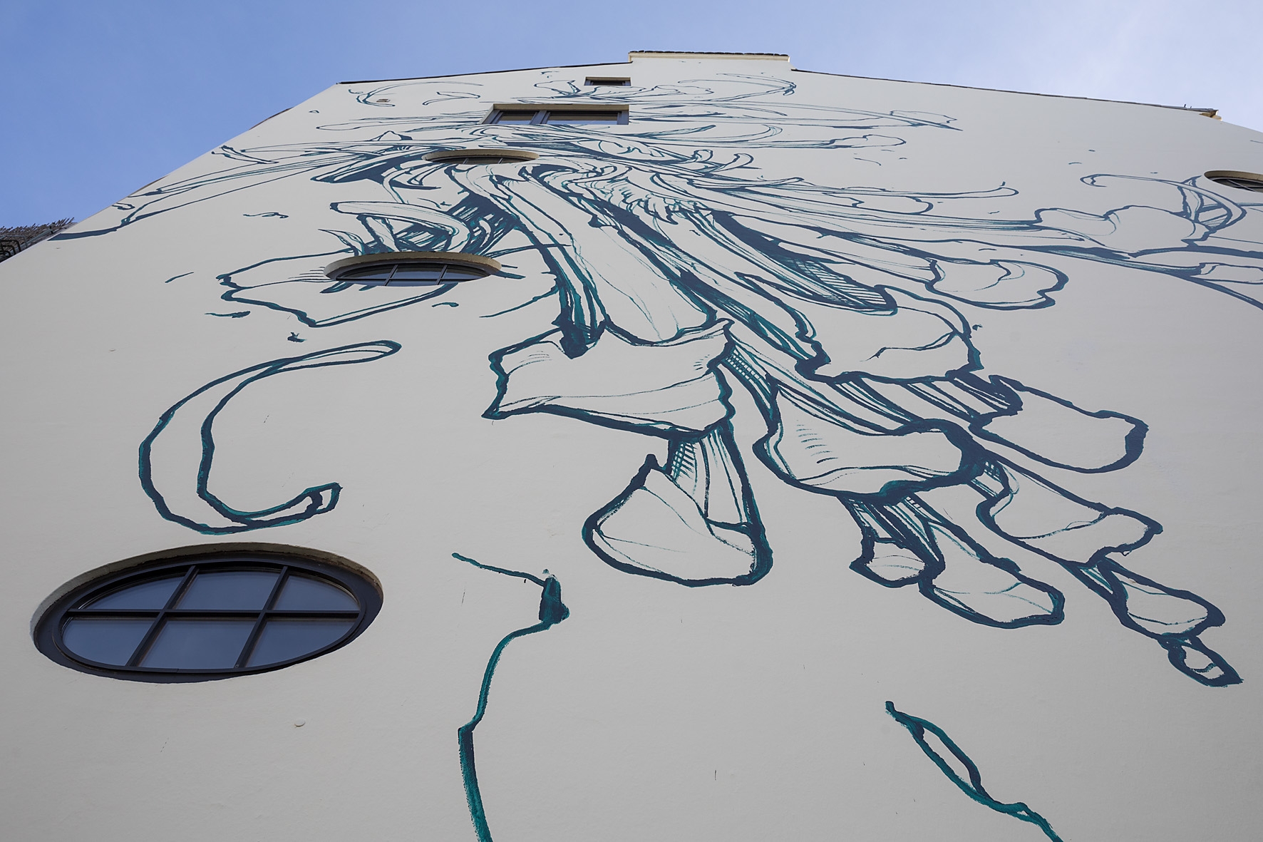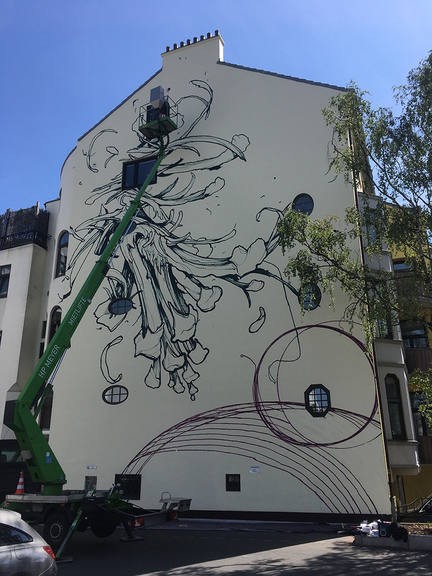 An der Fassade am Dobben 149 realisierte Hannes Middelberg eines seiner ersten Wandbilder – und bis heute sein größtes. Normalerweise in einer darstellenden wie auch experimentell abstrakten und seriellen Zeichenpraxis zwischen händischer und maschineller Arbeit sowie dem Tätowieren im Studio verortet, übertrug er seine Erfahrungen des Zeichnens und Tätowierens auf dem menschlichen Körper nun auf die monumentale Fläche der Hauswand.
