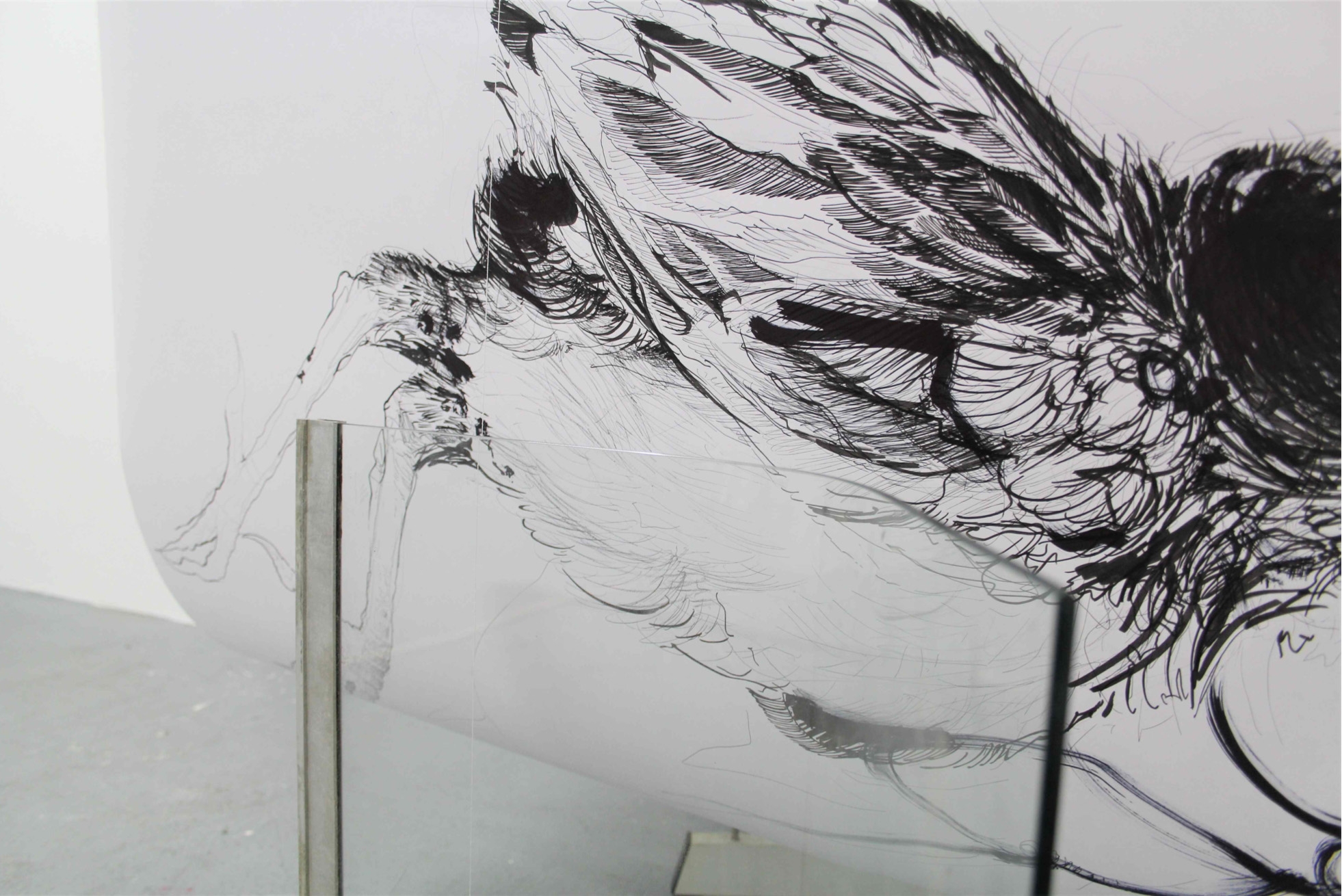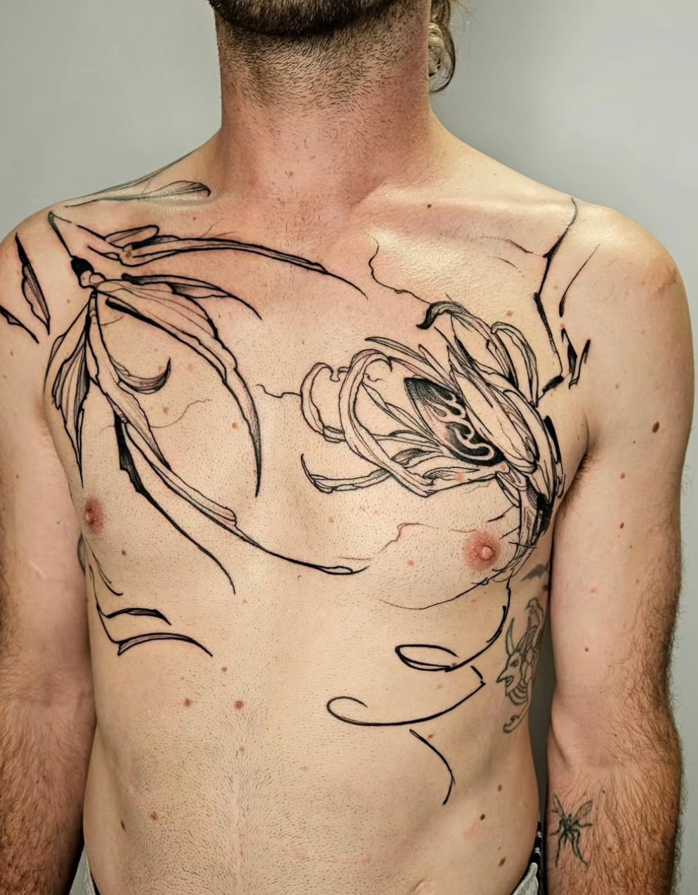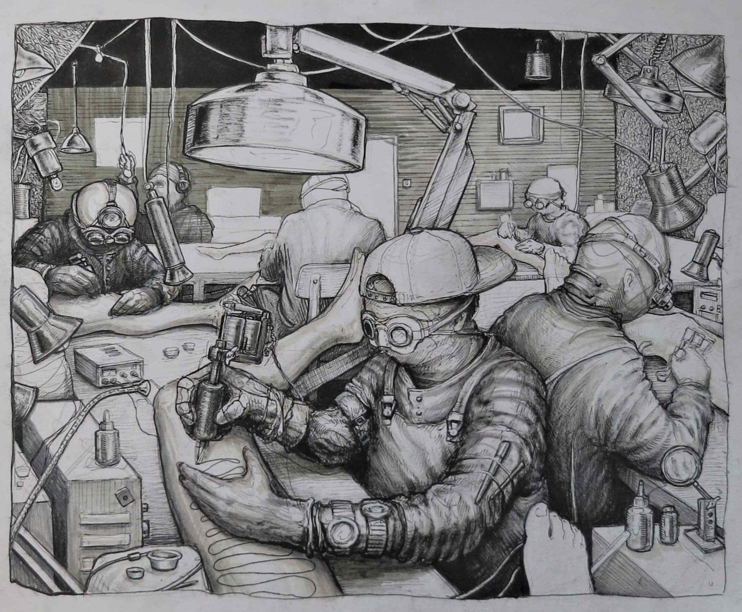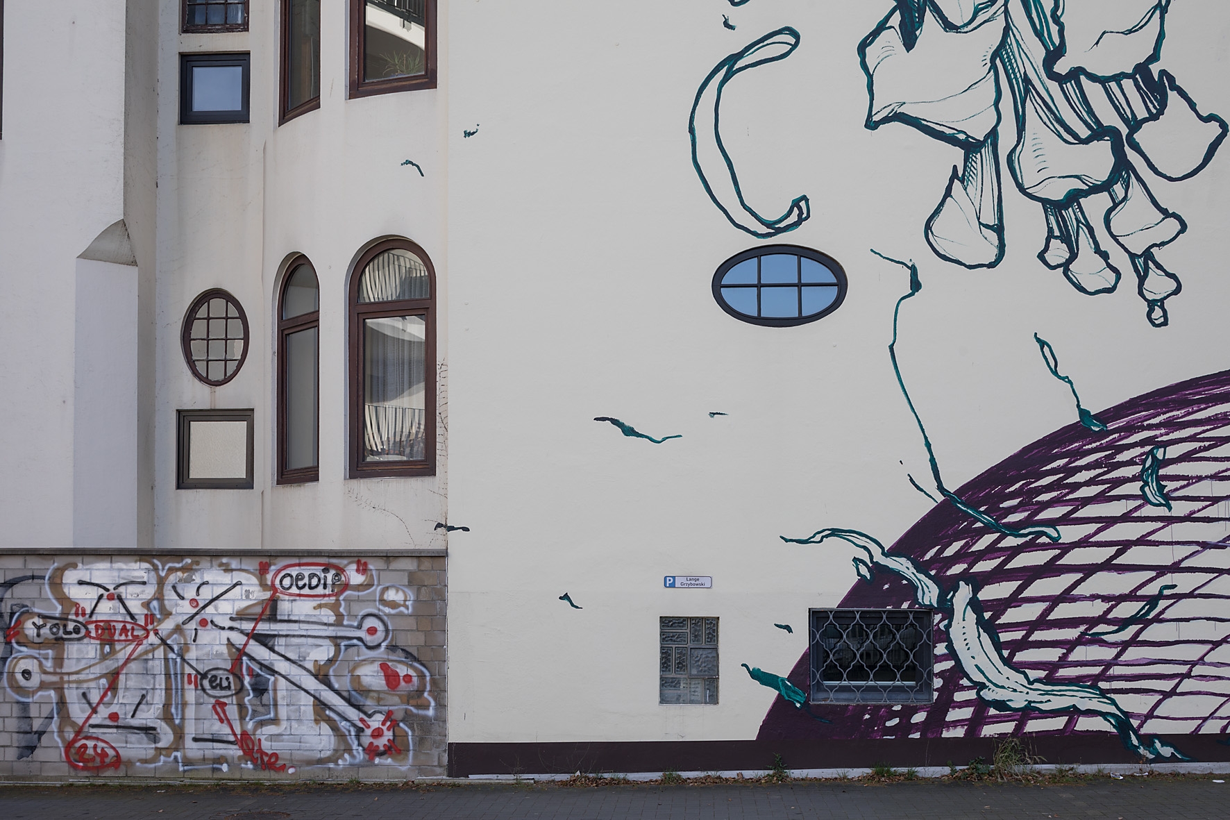 An der Fassade am Dobben 149 realisierte Hannes Middelberg eines seiner ersten Wandbilder – und bis heute sein größtes. Normalerweise in einer darstellenden wie auch experimentell abstrakten und seriellen Zeichenpraxis zwischen händischer und maschineller Arbeit sowie dem Tätowieren im Studio verortet, übertrug er seine Erfahrungen des Zeichnens und Tätowierens auf dem menschlichen Körper nun auf die monumentale Fläche der Hauswand.